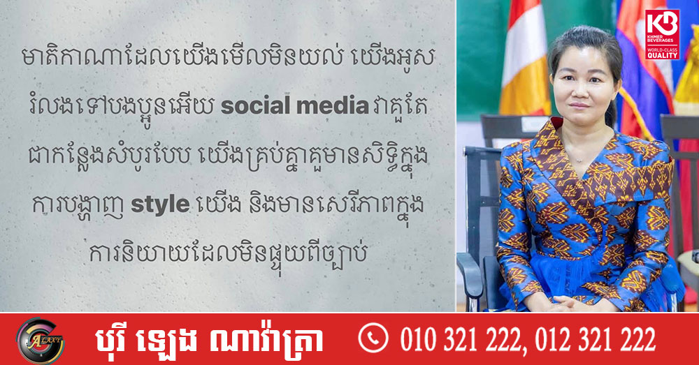 លោកស្រីបានបន្តថា «បើមិនដឹងថាភាសាជាតិខ្លួនមានតម្លៃប៉ុណ្ណា អាចសួរត្រឹមបញ្ញាសិប្បនិម្មិត (AI) ក៏បាន ហើយបើចង់ដឹងថាតើការនិយាយច្រឡូកច្រឡំលាយត្រឡប់ចុះឡើងនៃភាសានាំមកនូវគុណវិបត្តិអ្វីខ្លះសម្រាប់ភាសារជាតិ សួរត្រឹមបញ្ញាសិប្បនិម្មិតក៏បាន។ ខ្ញុំសូមដឹងគុណបុព្វបុរសខ្មែរគ្រប់ជំនាន់ដែលហ៊ានសូម្បីលះបង់ជីវិតដើម្បី បង្កើត និងរក្សាឱ្យមានភាសាជាតិមកដល់សព្វថ្ងៃ»។