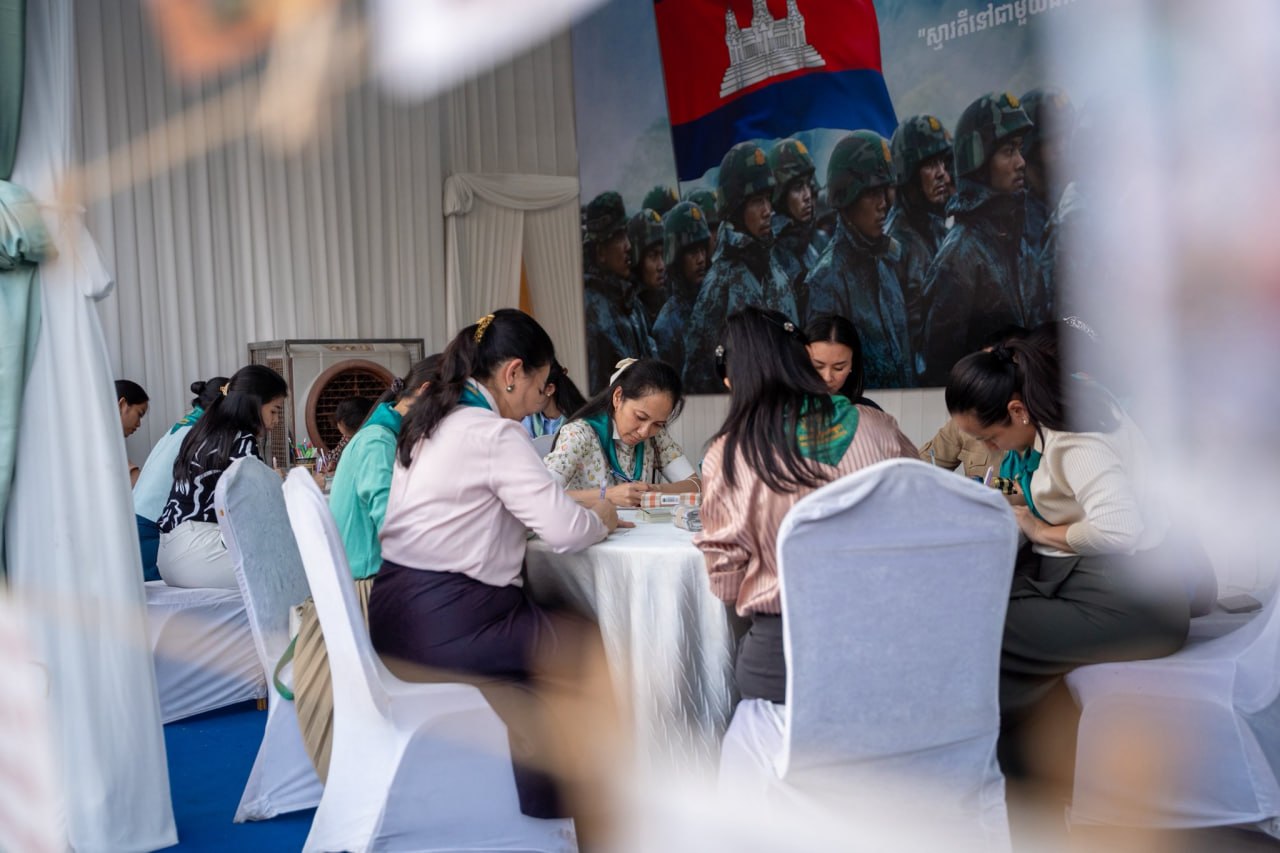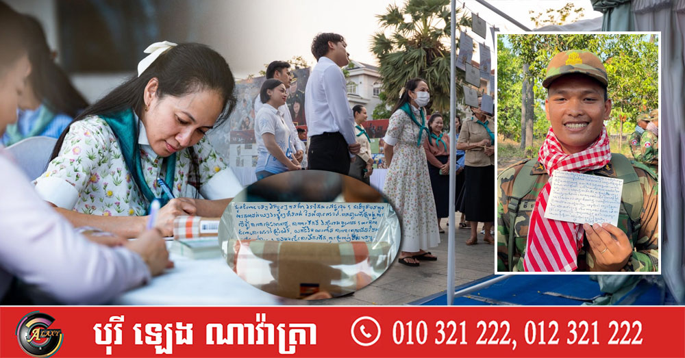 (ភ្នំពេញ)៖ ក្រុមយុវជនមួយក្រុមកាលពីពេលថ្មីៗនេះ បានរៀបចំកម្មវិធីទទួលក្រមា និងសរសេរសារជូនពរផ្ញើទៅកាន់កងទ័ពជួរមុខមុខ។ លោកជំទាវបណ្ឌិត ពេជ ចន្ទមុន្នី ភរិយាសម្តេចមហាបវរធិបតី ហ៊ុន ម៉ាណែត ក៏បានចូលរួមសរសេរសារជូនទៅកងទ័ពជួរមុខផងដែរ។