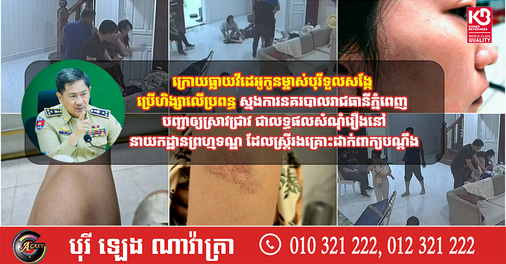 ក្រោយធ្លាយវីដេអូកូនម្ចាស់បុរីទួលសង្កែ ប្រើហិង្សាលើប្រពន្ធ ស្នងការនគរបាលរាជធានីភ្នំពេញ បញ្ជាឲ្យស្រាវជ្រាវ ជាលទ្ធផលសំណុំរឿងនៅនាយកដ្ឋានព្រហ្មទណ្ឌ ដែលស្រ្តីរងគ្រោះដាក់ពាក្យបណ្តឹង