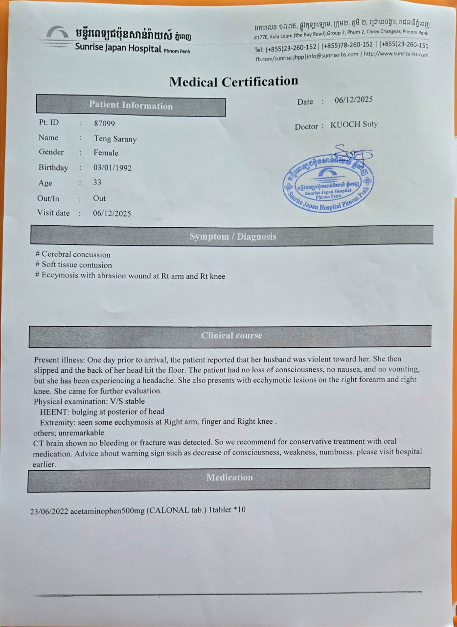 ដោយហេតុការណ៍នេះកើតឡើងអំឡុងឆ្នាំ២០២៥ ពាក់ព័ន្ធករណីនេះ ស្ត្រីរងគ្រោះមិនបានមកដាក់ពាក្យបណ្តឹងនៅសមត្ថកិច្ចមូលដ្ឋាននោះទេ។ ស្រ្តីរងគ្រោះបានទៅពាក្យបណ្តឹងនៅនាយកដ្ឋាននគរបាលព្រហ្មទណ្ឌ អគ្គស្នងការដ្ឋាននគរបាលជាតិ។ បច្ចុប្បន្នករណីហិង្សាខាងលើកំពុងស្ថិតក្នុងការអនុវត្តន៍តាមនីតិវិធីរបស់នាយកដ្ឋាននគរបាលព្រហ្មទណ្ឌ។
