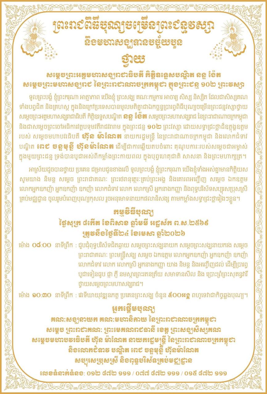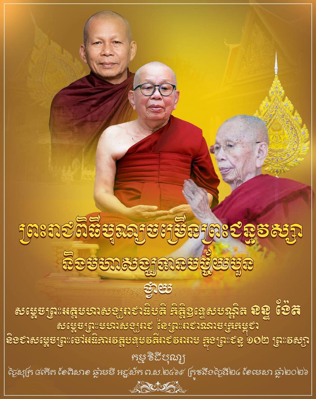 (ភ្នំពេញ)៖ ព្រះរាជពិធីបុណ្យចម្រើនព្រះជន្មវស្សា និងមហាសង្ឃទានបច្ច័យបួនថ្វាយសម្តេចព្រះអគ្គមហាសង្ឃរាជាធិបតី កិត្តិឧទ្ទេសបណ្ឌិត នន្ទ ង៉ែត សម្តេចព្រះមហាសង្ឃរាជ នៃព្រះរាជាណាចក្រកម្ពុជា ក្នុងព្រះជន្ម ១០២ ព្រះវស្សា នៅថ្ងៃទី២៤ ខែមេសា ឆ្នាំ២០២៦។ នេះបើតាមសេចក្តីជូនដំណឹងរបស់គណៈសង្ឃនាយក។
