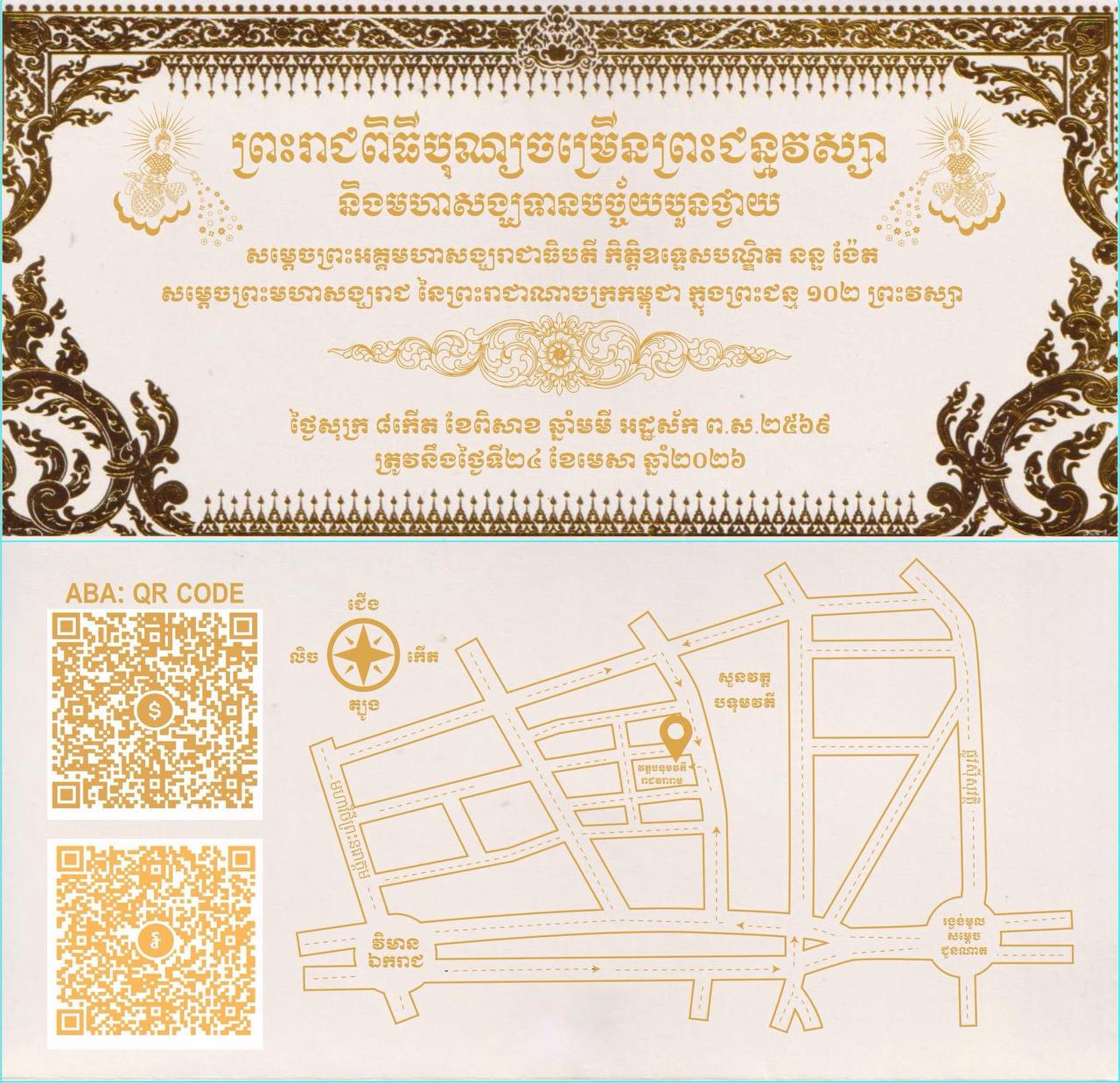 កម្មវិធីបុណ្យ នឹងរៀបចំថ្ងៃសុក្រ ៨កើត ខែពិសាខ ឆ្នាំមមី អដ្ឋស័ក ព.ស.២៥៦៩ ត្រូវនឹងថ្ងៃទី២៤ ខែមេសា ឆ្នាំ២០២៦ ហើយអ្នកផ្តើមបុណ្យ គឺគណៈសង្ឃនាយក គណៈមហានិកាយ នៃព្រះរាជាណាចក្រកម្ពុជា សម្តេចព្រះរាជាគណៈ ព្រះមេគណរាជធានី ខេត្ត ព្រះសង្ឃសិស្សគណ សម្តេចមហាបវរធិបតី ហ៊ុន ម៉ាណែត និងលោកជំទាវ បណ្ឌិត ពេជ ចន្ទមុន្នី ហ៊ុនម៉ាណែត សប្បុរសប្រុសស្រី និងពុទ្ធបរិស័ទគ្រប់មជ្ឈដ្ឋាន៕