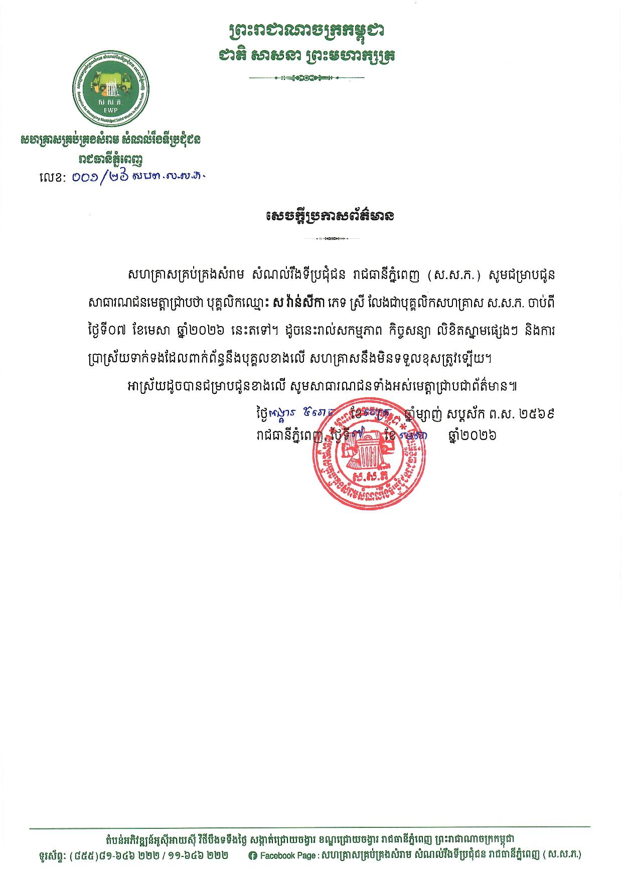 (ភ្នំពេញ)៖ សហគ្រាសគ្រប់គ្រងសំរាម សំណល់រឹងទីប្រជុំជន រាជធានីភ្នំពេញ (ស.ស.ភ.) នៅថ្ងៃទី១០ ខែមេសា ឆ្នាំ២០២៦នេះ បានចេញសេចក្ដីប្រកាសព័ត៌មានពីការបញ្ឈប់បុគ្គលិកម្នាក់ឈ្មោះ ស វ៉ាន់ស៊ីកា ភេទ ស្រី លែងជាបុគ្គលិកសហគ្រាស ស.ស.ភ. ចាប់ពី ថ្ងៃទី៧ ខែមេសា ឆ្នាំ២០២៦ នេះតទៅ។ ដូចនេះរាល់សកម្មភាព កិច្ចសន្យា លិខិតស្នាមផ្សេងៗ និងការ ប្រាស្រ័យទាក់ទងដែលពាក់ព័ន្ធនឹងបុគ្គលខាងលើ សហគ្រាសនឹងមិនទទួលខុសត្រូវឡើយ។