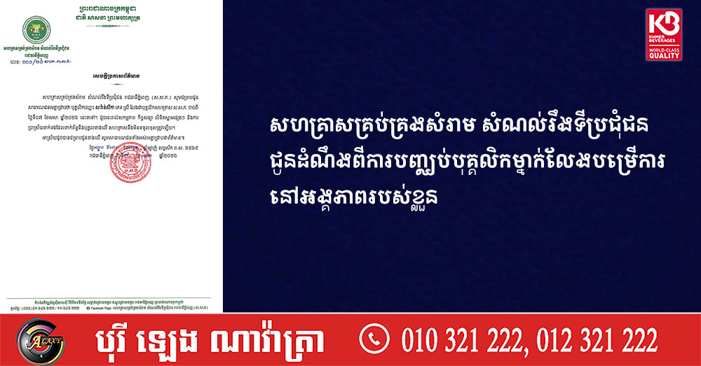 សហគ្រាសគ្រប់គ្រងសំរាម សំណល់រឹងទីប្រជុំជន ជូនដំណឹងពីការបញ្ឈប់បុគ្គលិកម្នាក់លែងបម្រើការនៅអង្គភាពរបស់ខ្លួន