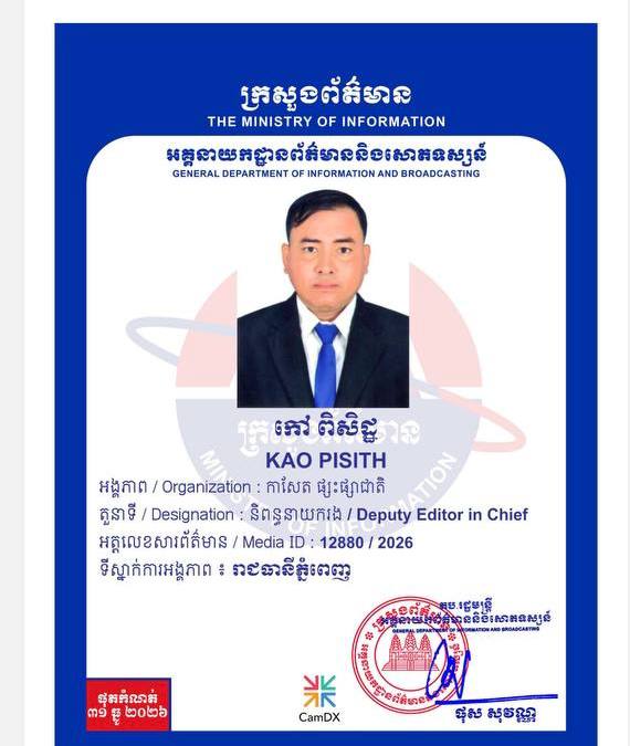 (ភ្នំពេញ)៖ រដ្ឋមន្រ្តីក្រសួងព័ត៌មាន លោក នេត្រ ភក្ដ្រា បានសម្រេចលុបសុពលភាពបណ្ណសម្គាល់សារព័ត៌មានចំពោះ បុគ្គលឈ្មោះ កៅ ពិសិដ្ឋ ហើយមិនអនុញ្ញាតឲ្យប្រកបអាជីពជាអ្នកសារព័ត៌មានតទៅទៀតនោះទេ។