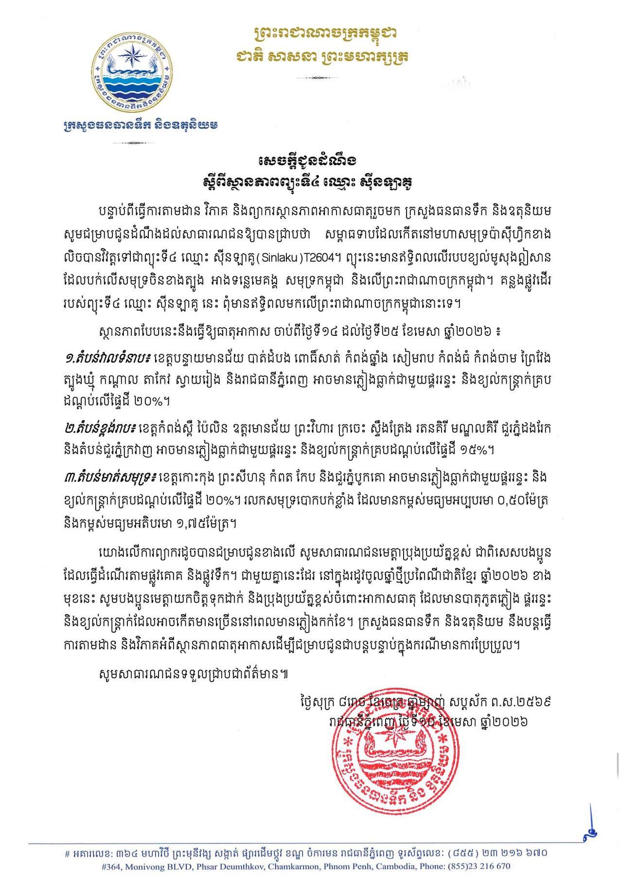 (ភ្នំពេញ)៖ បន្ទាប់ពីធ្វើការតាមដាន វិភាគ និងព្យាករស្ថានភាពអាកាសធាតុរួចមក ក្រសួងធនធានទឹក និងឧតុនិយម បានបញ្ជាក់ឱ្យដឹងថា សម្ពាធទាបដែលកើតនៅមហាសមុទ្រប៉ាស៊ីហ្វិកខាងលិច បានវិវត្តទៅជាព្យុះទី៤ ឈ្មោះ ស៊ីនឡាគូ (Sinlaku) T2604 ព្យុះនេះមានឥទ្ធិពលលើរបបខ្យល់មូសុងឦសាន ដែលបក់លើសមុទ្រចិនខាងត្បូង អាងទន្លេមេគង្គ សមុទ្រកម្ពុជា និងលើព្រះរាជាណាចក្រកម្ពុជា។ គន្លងផ្លូវដើររបស់ព្យុះទី៤នេះ ពុំមានឥទ្ធិពលមកលើព្រះរាជាណាចក្រកម្ពុជានោះទេ តែនឹងបណ្តាលឱ្យខេត្តមួយចំនួនអាចមានភ្លៀងធ្លាក់ជាមួយផ្គររន្ទះ។