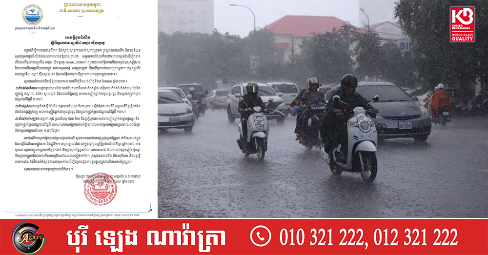 យោងលើការព្យាករដូចបានជម្រាបជូនខាងលើ សូមសាធារណជនមេត្តាប្រុងប្រយ័ត្នខ្ពស់ ជាពិសេសបងប្អូនដែលធ្វើដំណើរតាមផ្លូវគោគ និងផ្លូវទឹក។ ជាមួយគ្នានេះដែរ នៅក្នុងរដូវចូលឆ្នាំថ្មីប្រពៃណីជាតិខ្មែរ ឆ្នាំ២០២៦ ខាងមុខនេះ សូមបងប្អូនមេត្តាយកចិត្តទុកដាក់ និងប្រុងប្រយ័ត្នខ្ពស់ចំពោះអាកាសធាតុ ដែលមានបាតុភូតភ្លៀង ផ្គររន្ទះ និងខ្យល់កន្ត្រាក់ដែលអាចកើតមានច្រើននៅពេលមានភ្លៀងកក់ខែ។ ក្រសួងធនធានទឹក និងឧតុនិយម នឹងបន្តធ្វើ ការតាមដាន និងវិភាគអំពីស្ថានភាពធាតុអាកាសដើម្បីជម្រាបជូនជាបន្តបន្ទាប់ក្នុងករណីមានការប្រែប្រួល៕