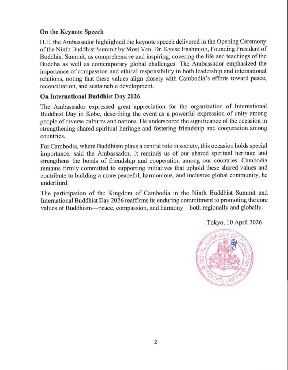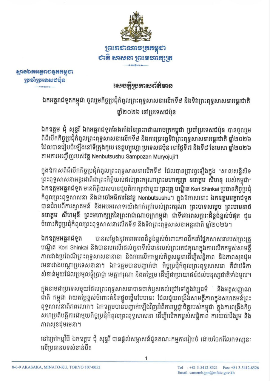 ឯកអគ្គរាជទូតកម្ពុជាប្រចាំប្រទេសជប៉ុន ចូលរួមកិច្ចប្រជុំកំពូលព្រះពុទ្ធសាសនាលើកទី៩ និងទិវាព្រះពុទ្ធសាសនាអន្តរជាតិ ឆ្នាំ២០២៦ នៅប្រទេសជប៉ុន