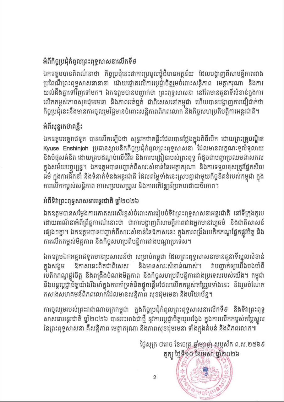 ក្នុងឱកាសនោះ លោកអគ្គរាជទូត បានជំរាបពីការស្វាគមន៍ និងអបអរសាទរយ៉ាងកក់ក្តៅរបស់ព្រះករុណា ព្រះបាទសម្តេច ព្រះបរមនាថ នរោត្តម សីហមុនី ព្រះមហាក្សត្រនៃព្រះរាជាណាចក្រកម្ពុជា ជាទីគោរពសក្ការៈដ៏ខ្ពង់ខ្ពស់បំផុត ជូន ចំពោះកិច្ចប្រជុំកំពូលព្រះពុទ្ធសាសនាលើកទី៩ និងទិវាព្រះពុទ្ធសាសនាអន្តរជាតិ ឆ្នាំ២០២៦។