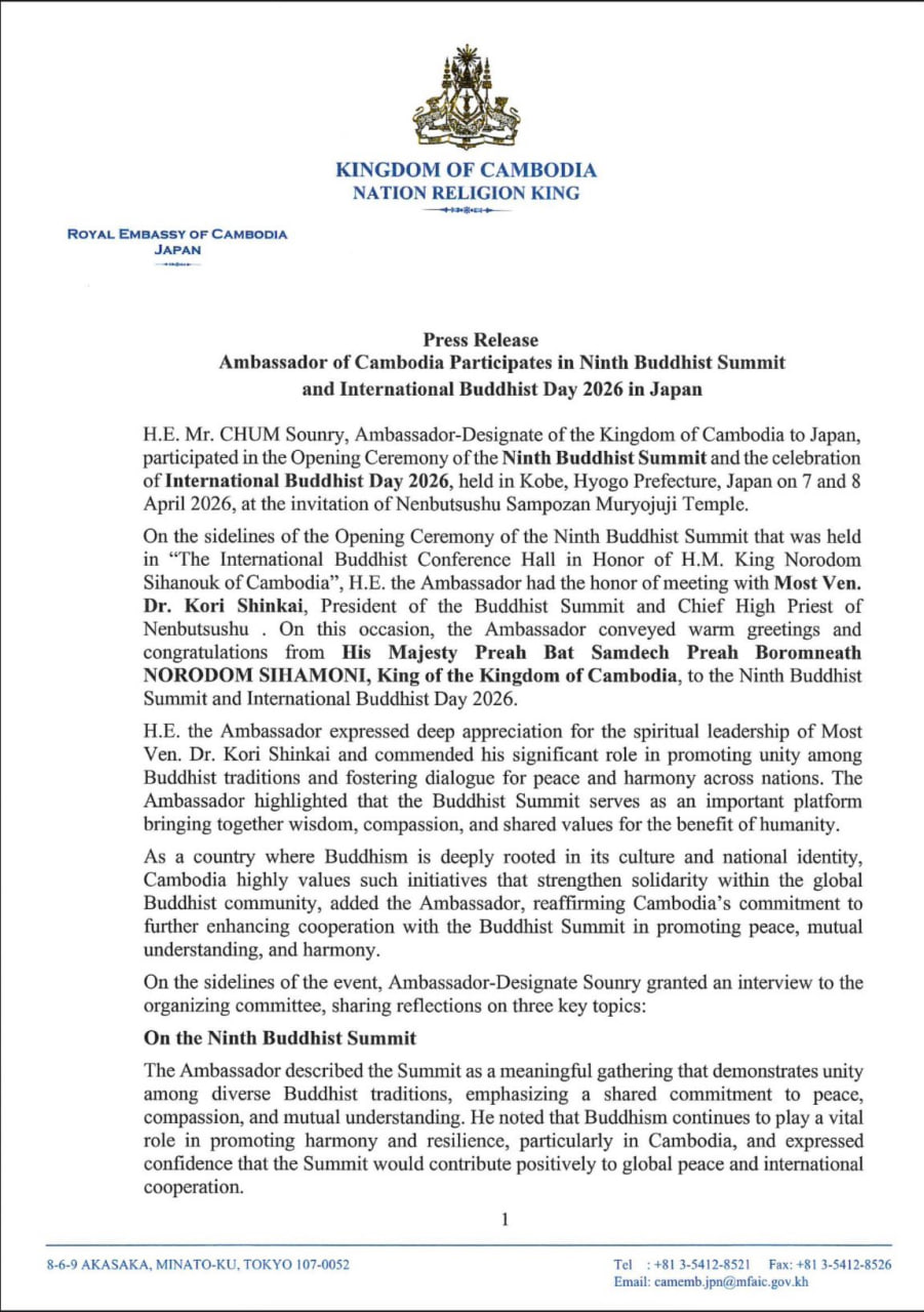 (ជប៉ុន)៖ លោក ជុំ សុន្ទរី ឯកអគ្គរាជទូតតែងតាំង នៃព្រះរាជាណាចក្រកម្ពុជា ប្រចាំប្រទេសជប៉ុន បានចូលរួមពិធីបើកកិច្ចប្រជុំកំពូលព្រះពុទ្ធសាសនាលើកទី៩ និងការប្រារព្ធទិវាព្រះពុទ្ធសាសនាអន្តរជាតិ ឆ្នាំ២០២៦ ដែលបានរៀបចំឡើងនៅទីក្រុងកូបេ ខេត្តហ្សូហ្គោ ប្រទេសជប៉ុន នៅថ្ងៃទី៧ និងទី៨ ខែមេសា ឆ្នាំ២០២៦ តាមការអញ្ជើញរបស់វត្ត Nenbutsushu Sampozan Muryojuji។