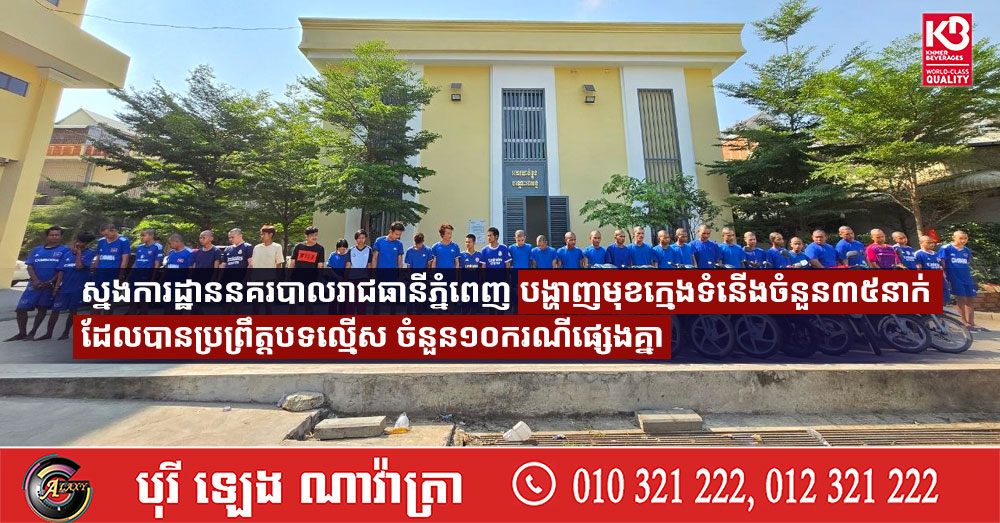 (ភ្នំពេញ)៖ ដោយអនុវត្តតាមបទបញ្ជាពីលោកឧត្តមសេនីយ៍ឯក ជួន ណារិន្ទ អគ្គស្នងការរង និងជាស្នងការនគរបាលរាជធានីភ្នំពេញ នាព្រឹកថ្ងៃទី១០ ខែមេសា ឆ្នាំ២០២៦ នៅស្នងការដ្ឋាននគរបាលរាជធានីភ្នំពេញ លោកឧត្តមសេនីយ៍ត្រី ប៊ុន សត្យា ស្នងការរង ផែនការងារនគរបាលព្រហ្មទណ្ឌ លោកឧត្តមសេនីយ៍ទោ លី ប៊ុនអេង ស្នងការរង ទទួលដឹកនាំការិយាល័យនគរបាលព្រហ្មទណ្ឌកម្រិតស្រាល និងលោកវរសេនីយ៍ឯក ម៉ម សាវ៉ន នាយការិយាល័យនគរបាលព្រហ្មទណ្ឌកម្រិតស្រាល បានដឹកនាំកម្លាំងធ្វើការបង្ហាញមុខក្រុមជនសង្ស័យជាក្មេងទំនើងចំនួន៣៥នាក់ (ស្រី២នាក់) ពាក់ព័ន្ធប្រព្រឹត្តបទល្មើស១០ករណីផ្សេងគ្នា។