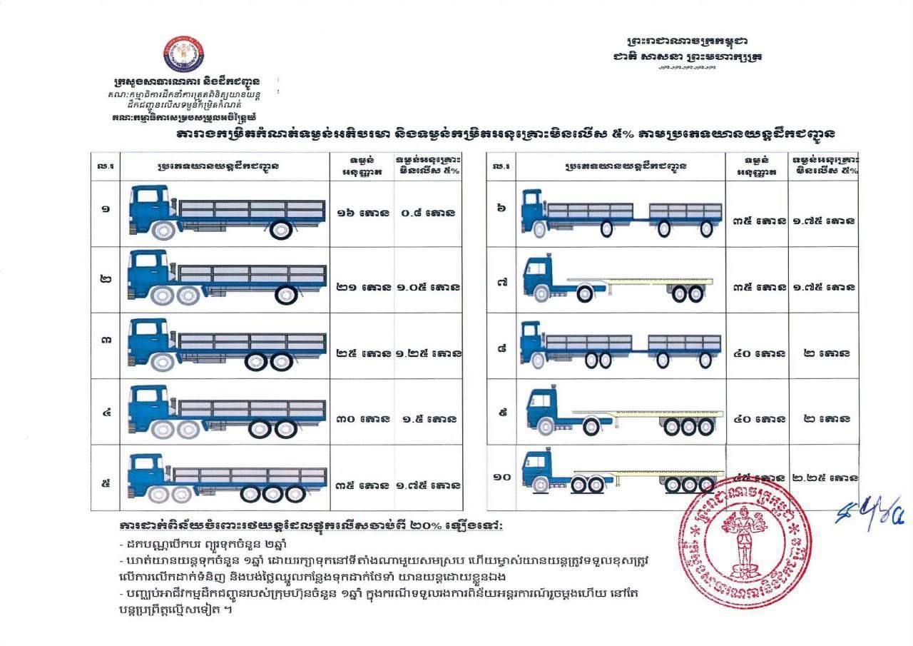 ក្រសួងសាធារណការ និងដឹកជញ្ជូន សូមក្រើនរម្លឹកដល់ម្ចាស់ក្រុមហ៊ុនដឹកជញ្ជូនធុនធ្ងន់ ម្ចាស់យានយន្តដឹកជញ្ជូនធុនធ្ងន់ និងអ្នកបើកបរយានយន្តធុនធ្ងន់ទាំងអស់ សូមចូលរួមគោរពច្បាប់ និងគោរពតម្រាយផ្លូវអនុញ្ញាតសម្រាប់យានយន្តចាប់ពីភ្លៅ៦ឡើង ដែលក្រសួងបានណែនាំឱ្យបានត្រឹមត្រូវ។ ក្រុមការងារចល័តពិសេស នឹងបន្តចុះឆ្មក់ត្រួតពិនិត្យយានយន្តដឹកជញ្ជូនលើសទម្ងន់កម្រិតកំណត់នៅទូទាំងប្រទេស ដើម្បីទប់ស្កាត់ និងចាត់វិធានការរឹតបន្តឹងការអនុវត្តច្បាប់យ៉ាងតឹងរ៉ឹងដោយគ្មានការលើកលែងឡើយ៕