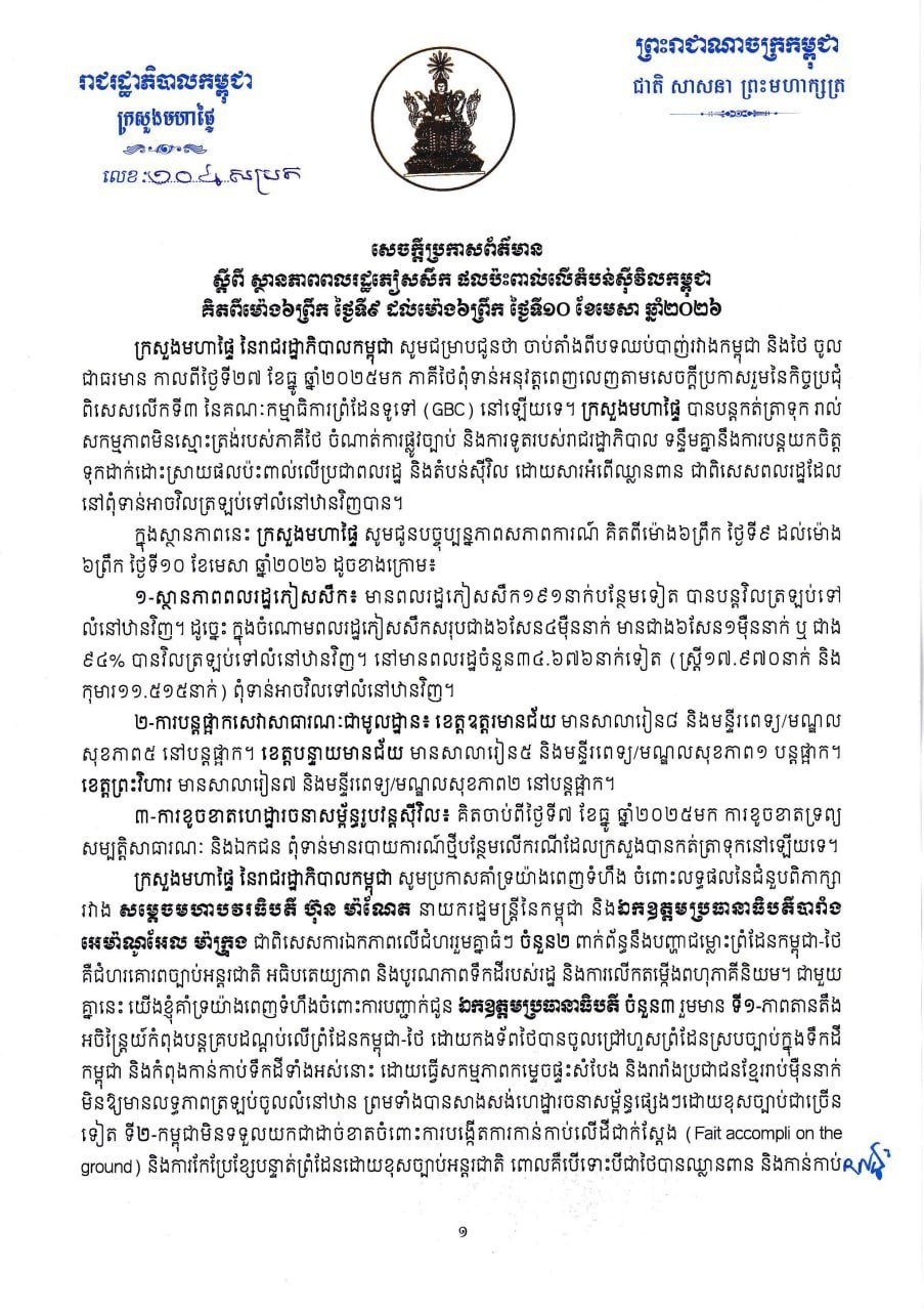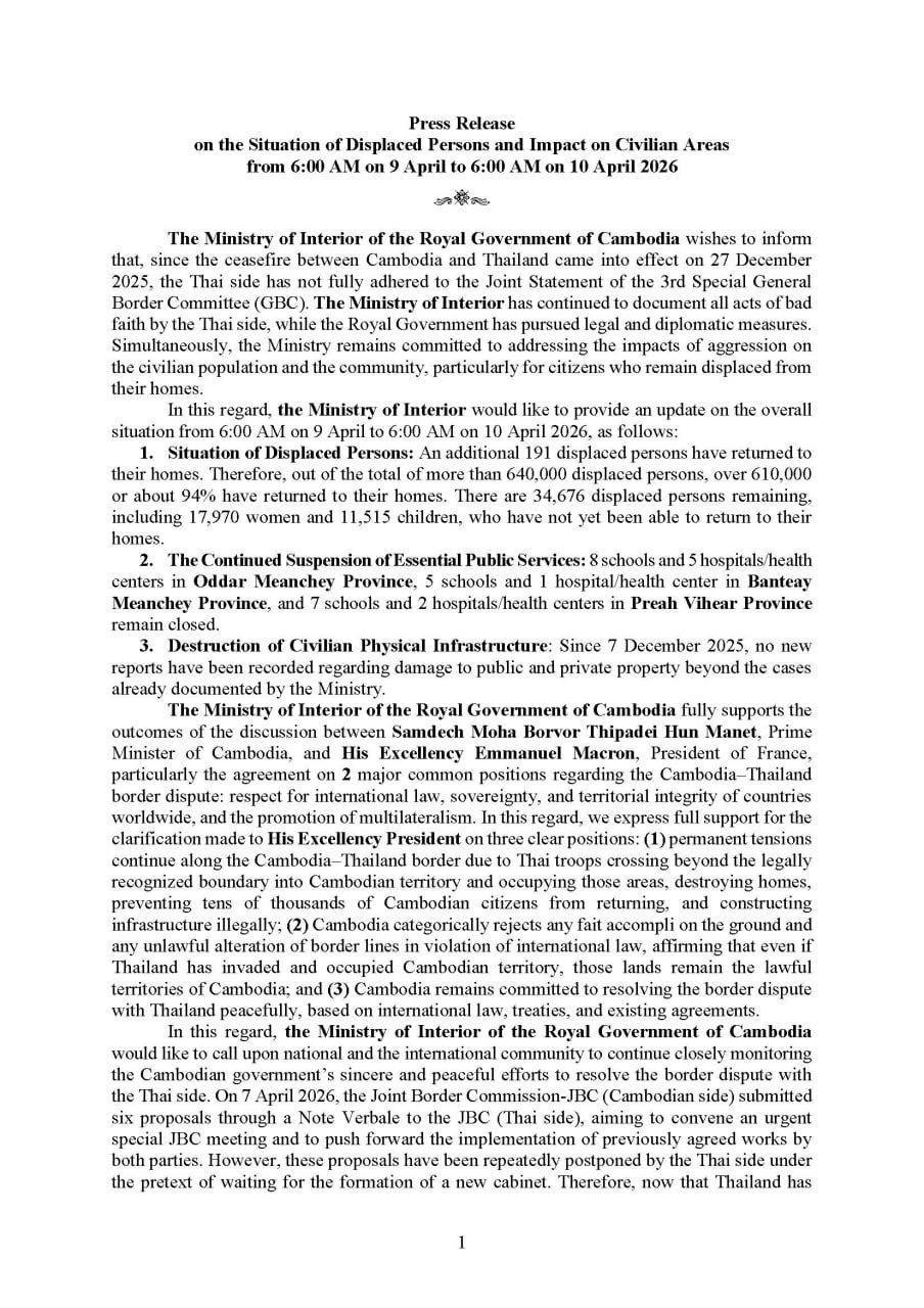 (ភ្នំពេញ)៖ ក្រសួងមហាផ្ទៃ នៅថ្ងៃទី១០ ខែមេសា ឆ្នាំ២០២៦នេះ បានឲ្យដឹងថា គិតចាប់ពីម៉ោង ៦ព្រឹក ថ្ងៃទី០៩ ខែមេសា ដល់ម៉ោង៦ព្រឹក ថ្ងៃទី១០ ខែមេសា ឆ្នាំ២០២៦នេះ មានប្រជាពលរដ្ឋភៀសសឹក ១៩១នាក់បន្ថែមទៀត បានវិលត្រឡប់ទៅលំនៅឋានវិញ។ ដូច្នេះក្នុងចំណោមពលរដ្ឋភៀសសឹកសរុបជាង៦សែន ៤ម៉ឺននាក់ មានជាង ៦សែន ១ម៉ឺននាក់ ស្មើជាង ៩៤ភាគរយ បានវិលត្រឡប់ទៅលំនៅឋានវិញ។