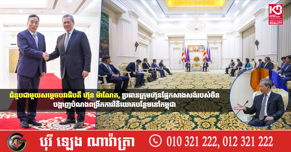 ជំនួបជាមួយសម្ដេចបវរធិបតី ហ៊ុន ម៉ាណែត, ប្រធានក្រុមហ៊ុនផ្នែកសាងសង់របស់ចិន បង្ហាញបំណងពង្រីកការវិនិយោគបន្ថែមនៅកម្ពុជា (Video inside)