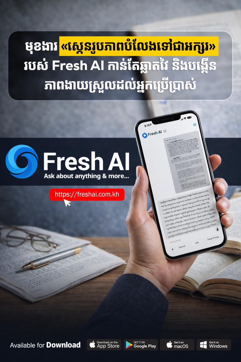ភាពលេចធ្លោនៃមុខងារនេះ ស្ថិតនៅលើសមត្ថភាពនៃការយល់ដឹងពីបរិបទអក្ខរាវិរុទ្ធភាសាខ្មែរយ៉ាងច្បាស់លាស់ ទោះបីជាអត្ថបទនោះស្ថិតក្នុងទម្រង់ជាសៀវភៅ កិច្ចសន្យាផ្លូវការ ឬឯកសារច្បាប់ដែលស្មុគស្មាញក៏ដោយ។ អ្នកប្រើប្រាស់គ្រាន់តែថតរូបភាព រួចបញ្ជូនទៅកាន់ Fresh AI វានឹងធ្វើការវិភាគ និងទាញយកអត្ថបទចេញមកវិញក្នុងរយៈពេលដ៏ខ្លីបំផុត ដែលអនុញ្ញាតឱ្យគេអាចយកទៅកែសម្រួល ឬចែកចាយបន្តបានភ្លាមៗ។