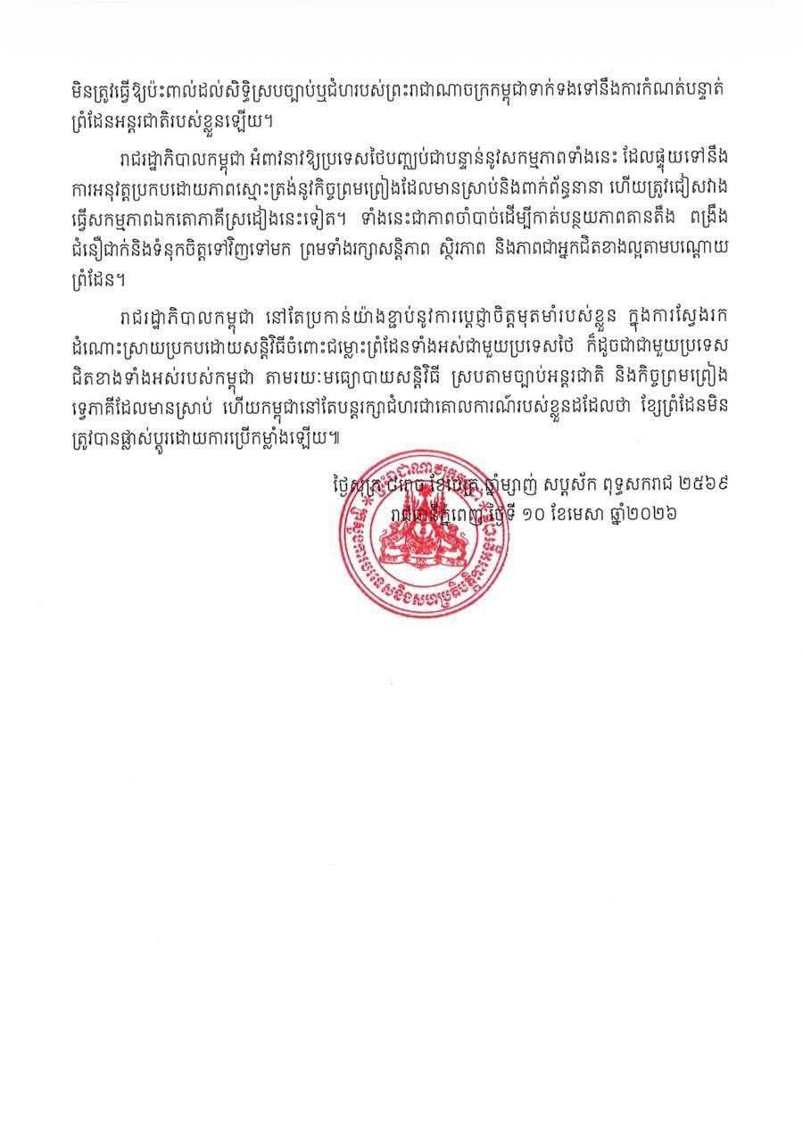 រាជរដ្ឋាភិបាលកម្ពុជា នៅតែប្រកាន់យ៉ាងខ្ជាប់នូវការប្តេជ្ញាចិត្តមុតមាំរបស់ខ្លួន ក្នុងការស្វែងរកដំណោះស្រាយ ប្រកបដោយសន្តិវិធីចំពោះជម្លោះព្រំដែនទាំងអស់ ជាមួយប្រទេសថៃ ក៏ដូចជាជាមួយប្រទេសជិតខាងទាំងអស់របស់កម្ពុជា តាមរយៈមធ្យោបាយសន្តិវិធីស្របតាមច្បាប់អន្តរជាតិ និងកិច្ចព្រមព្រៀង