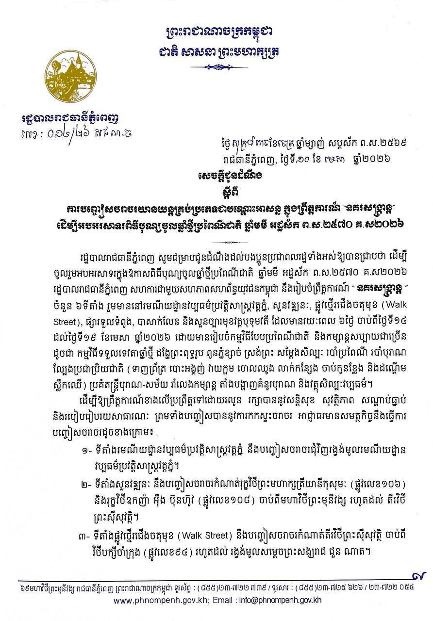 (ភ្នំពេញ)៖ ដើម្បីចូលរួមអបអរសាទរ ក្នុងឱកាសពិធីបុណ្យចូលឆ្នាំថ្មី ប្រពៃណីជាតិ ឆ្នាំមមី អដ្ឋស័ក ព.ស.២៥៧០ គ.ស២០២៦ រដ្ឋបាលរាជធានីភ្នំពេញ សហការជាមួយសហភាពសហព័ន្ធយុវជនកម្ពុជា នឹងរៀបចំព្រឹត្តការណ៍ «នគរសង្ក្រាន្ត» ចំនួន ៦ទីតាំង រួមមាននៅរមណីយដ្ឋានវប្បធម៌ប្រវត្តិសាស្ត្រវត្តភ្នំ, សួនវឌ្ឍនៈ, ផ្លូវថ្មើរជើងចតុមុខ (Walk Street), ផ្សារទួលទំពូង, បាសាក់លែន និងសួនច្បារមុខវត្តបុទុមវតី ដែលមានរយៈពេល៦ថ្ងៃ ចាប់ពីថ្ងៃទី១៤ ដល់ថ្ងៃទី១៩ ខែមេសា ឆ្នាំ២០២៦ ដោយមានរៀបចំកម្មវិធីបែបប្រពៃណីជាតិ និងកម្សាន្តសប្បាយជាច្រើន ដូចជា កម្មវិធីទទួលទេវតាឆ្នាំថ្មី ដង្ហែព្រះពុទ្ធរូប ពូនភ្នំខ្សាច់ ស្រង់ព្រះ សម្តែងសិល្បៈ របាំប្រពៃណី របាំបុរាណ ល្បែងប្រជាប្រិយជាតិ (ទាញព្រ័ត្រ បោះអង្គញ់ វាយក្អម ចោលឈូង លាក់កន្សែង ចាប់កូនខ្លែង និងដណ្តើម ស្លឹកឈើ) ប្រគំតន្ត្រីបុរាណ-សម័យ រាំលេងកម្សាន្ត តាំងបង្ហាញគំនូរបុរាណ និងវត្ថុសិល្បៈវប្បធម៌។