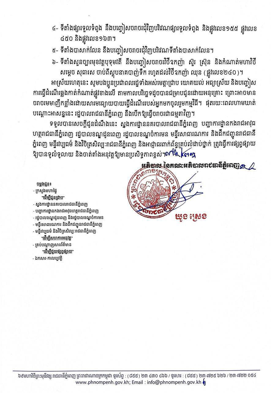 ដើម្បីឲ្យព្រឹត្តការណ៍ខាងលើប្រព្រឹត្តទៅដោយរលូន រក្សាបាននូវសន្តិសុខ សុវត្ថិភាព សណ្តាប់ធ្នាប់ និងរបៀបរៀបរយសាធារណៈ ព្រមទាំងបញ្ចៀសបាននូវការកកស្ទះចរាចរ អាជ្ញាធរមានសមត្ថកិច្ច នឹងធ្វើការបញ្ចៀសចរាចរ នៅតំបន់មួយចំនួន។