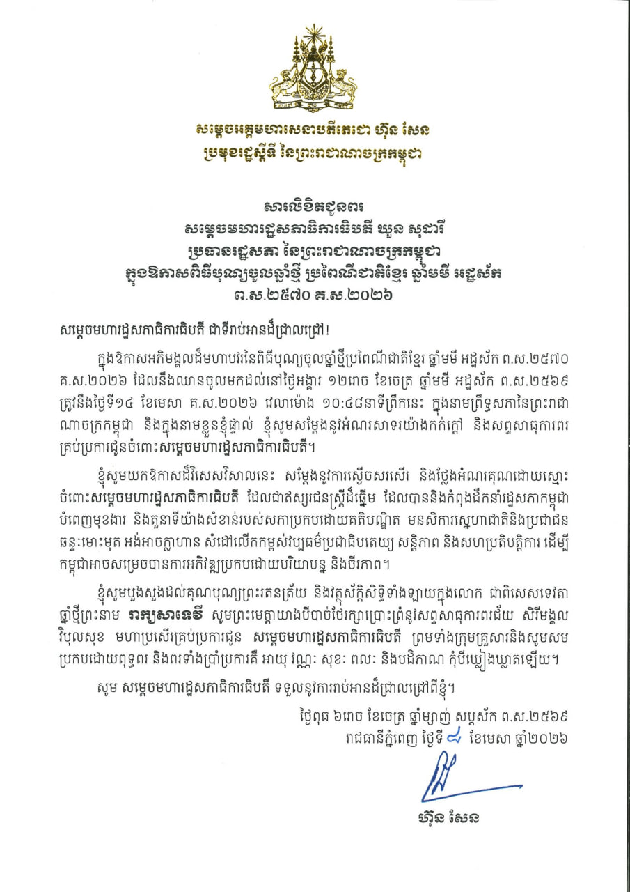 សារលិខិតរបស់សម្តេចតេជោ ហ៊ុន សែន មានខ្លឹមសារទាំងស្រុងដូចតទៅ៖ «ក្នុងឱកាសអភិមង្គលដ៏មហាបវរនៃពិធីបុណ្យចូលឆ្នាំថ្មីប្រពៃណីជាតិខ្មែរ ឆ្នាំមមី អដ្ឋស័ក ព.ស.២៥៧០ គ.ស.២០២៦ ដែលនឹងឈានចូលមកដល់នៅថ្ងៃអង្គារ ១២រោច ខែចេត្រ ឆ្នាំមមី អដ្ឋស័ក ព.ស.២៥៦៩ ត្រូវនឹងថ្ងៃទី១៤ ខែមេសា គ.ស.២០២៦ វេលាម៉ោង ១០:៤៨នាទីព្រឹកនេះ ក្នុងនាមព្រឹទ្ធសភានៃព្រះរាជា ណាចក្រកម្ពុជា និងក្នុងនាមខ្លួនខ្ញុំផ្ទាល់ ខ្ញុំសូមសម្តែងនូវអំណរសាទរយ៉ាងកក់ក្តៅ និងសព្ទសាធុការពរ គ្រប់ប្រការជូនចំពោះសម្តេចមហារដ្ឋសភាធិការធិបតី។