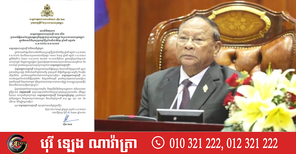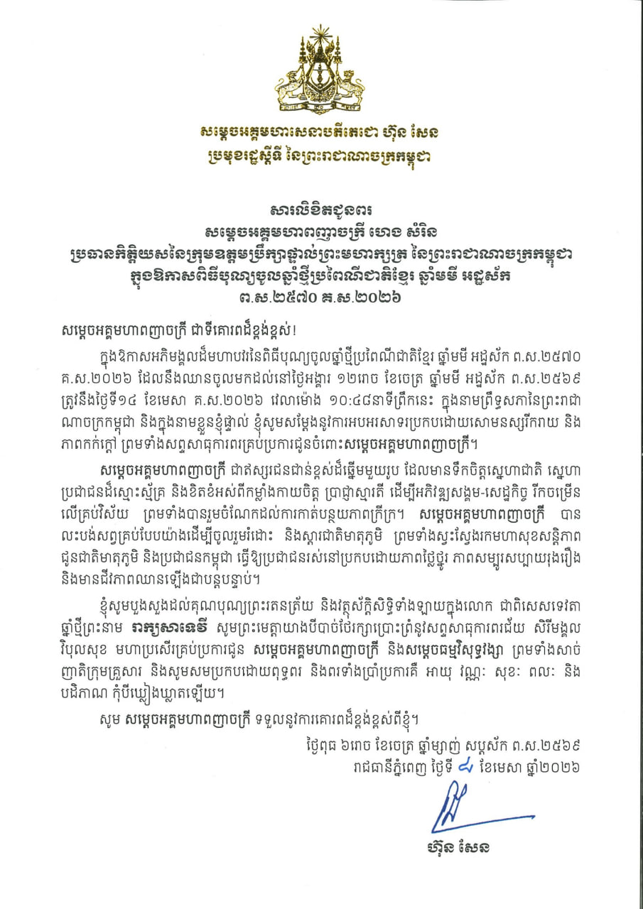 (ភ្នំពេញ)៖ សម្តេចអគ្គមហាសេនាបតីតេជោ ហ៊ុន សែន ប្រមុខរដ្ឋស្តីទីនៃកម្ពុជា បានផ្ញើសារលិខិតជូនពរ សម្តេចអគ្គមហាពញាចក្រី ហេង សំរិន ប្រធានកិត្តិយសនៃក្រុមឧត្តមប្រឹក្សាផ្ទាល់ព្រះមហាក្សត្រ នៃព្រះរាជាណាចក្រកម្ពុជា ក្នុងឱកាសពិធីបុណ្យចូលឆ្នាំថ្មីប្រពៃណីជាតិខ្មែរ ឆ្នាំមមី អដ្ឋស័ក ព.ស.២៥៧០ គ.ស.២០២៦។