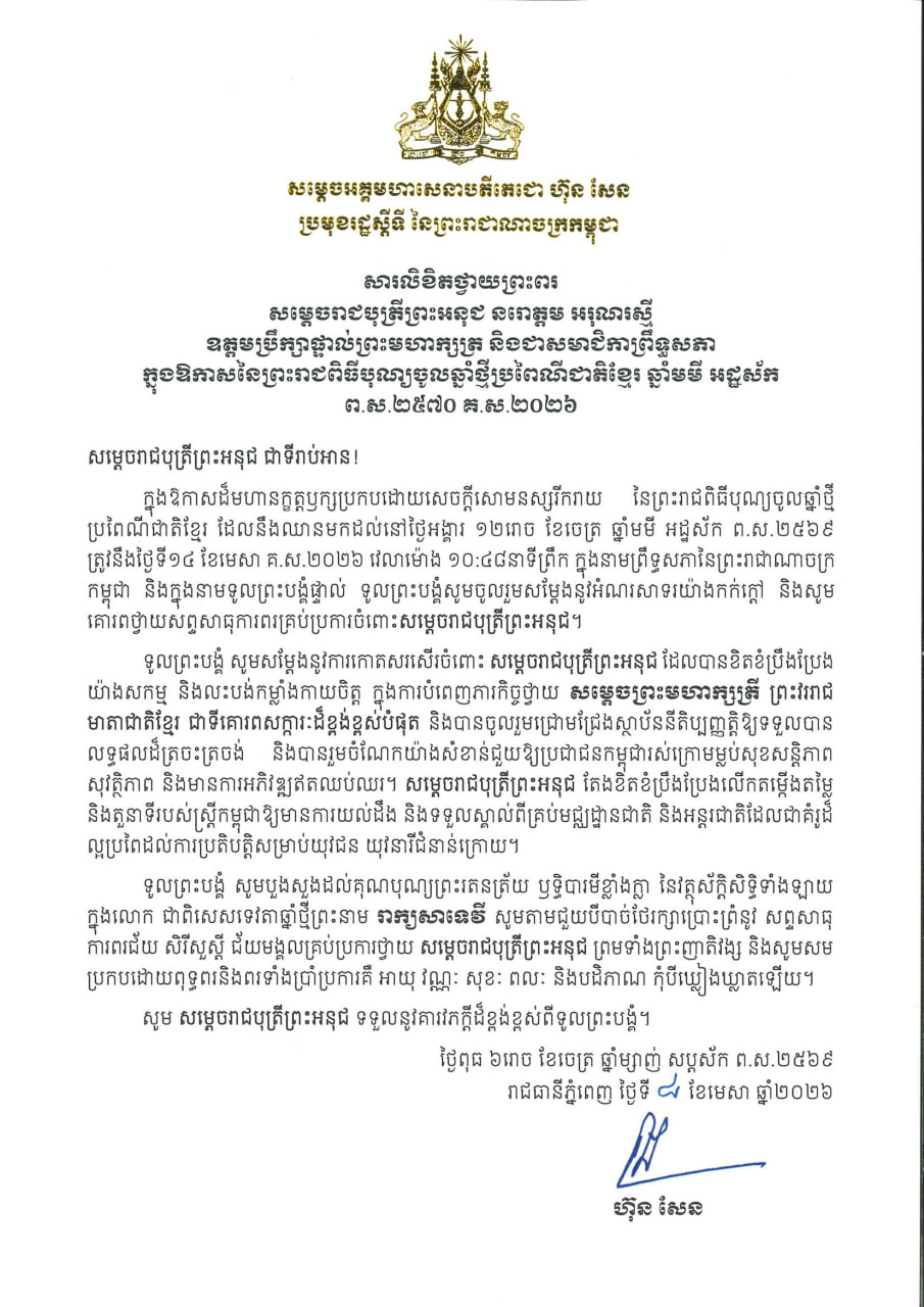 សារលិខិតរបស់សម្តេចតេជោ ហ៊ុន សែន មានខ្លឹមសារទាំងស្រុងដូចតទៅ៖ « ក្នុងឱកាសដ៏មហានក្ខត្តឫក្សប្រកបដោយសេចក្តីសោមនស្សរីករាយ នៃព្រះរាជពិធីបុណ្យចូលឆ្នាំថ្មី ប្រពៃណីជាតិខ្មែរ ដែលនឹងឈានមកដល់នៅថ្ងៃអង្គារ ១២រោច ខែចេត្រ ឆ្នាំមមី អដ្ឋស័ក ព.ស.២៥៦៩ ត្រូវនឹងថ្ងៃទី១៤ ខែមេសា គ.ស.២០២៦ វេលាម៉ោង ១០:៤៨នាទីព្រឹក ក្នុងនាមព្រឹទ្ធសភានៃព្រះរាជាណាចក្រ កម្ពុជា និងក្នុងនាមទូលព្រះបង្គំផ្ទាល់ ទូលព្រះបង្គំសូមចូលរួមសម្តែងនូវអំណរសាទរយ៉ាងកក់ក្តៅ និងសូម គោរពថ្វាយស់ព្ទសាធុការពរគ្រប់ប្រការចំពោះសម្តេចរាជបុត្រីព្រះអនុជ។