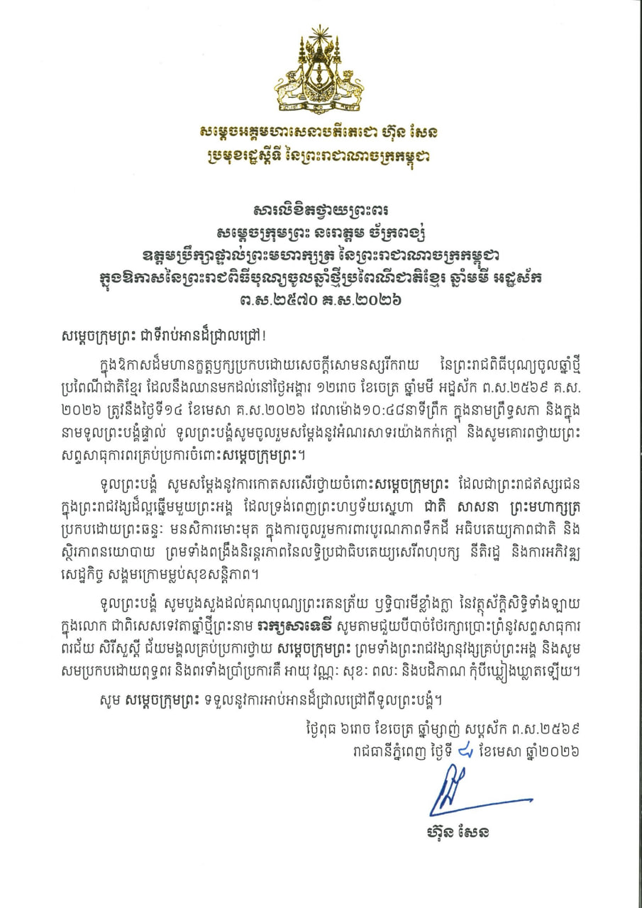 សារលិខិតរបស់សម្តេចតេជោ ហ៊ុន សែន មានខ្លឹមសារទាំងស្រុងដូចតទៅ៖ « ក្នុងឱកាសដ៏មហានក្ខត្តឫក្សប្រកបដោយសេចក្តីសោមនស្សរីករាយ នៃព្រះរាជពិធីបុណ្យចូលឆ្នាំថ្មី ប្រពៃណីជាតិខ្មែរ ដែលនឹងឈានមកដល់នៅថ្ងៃអង្គារ ១២រោច ខែចេត្រ ឆ្នាំមមី អដ្ឋស័ក ព.ស.២៥៦៩ គ.ស. ២០២៦ ត្រូវនឹងថ្ងៃទី១៤ ខែមេសា គ.ស.២០២៦ វេលាម៉ោង១០:៤៨នាទីព្រឹក ក្នុងនាមព្រឹទ្ធសភា និងក្នុង នាមទូលព្រះបង្គំផ្ទាល់ ទូលព្រះបង្គំសូមចូលរួមសម្តែងនូវអំណរសាទរយ៉ាងកក់ក្តៅ និងសូមគោរពថ្វាយព្រះ សព្ទសាធុការពរគ្រប់ប្រការចំពោះសម្តេចក្រុមព្រះ។