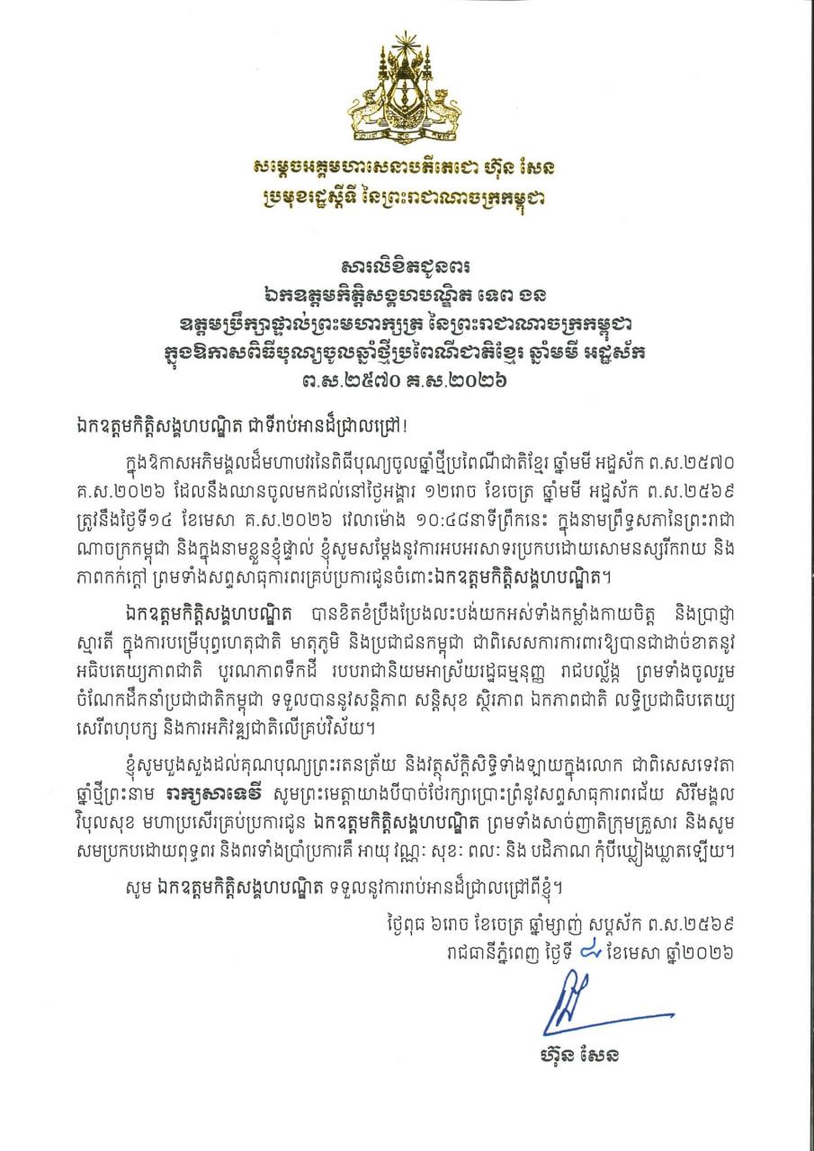 សារលិខិតរបស់សម្តេចតេជោ ហ៊ុន សែន មានខ្លឹមសារទាំងស្រុងដូចតទៅ៖ « ក្នុងឱកាសអភិមង្គលដ៏មហាបវរនៃពិធីបុណ្យចូលឆ្នាំថ្មីប្រពៃណីជាតិខ្មែរ ឆ្នាំមមី អដ្ឋស័ក ព.ស.២៥៧០ គ.ស.២០២៦ ដែលនឹងឈានចូលមកដល់នៅថ្ងៃអង្គារ ១២រោច ខែចេត្រ ឆ្នាំមមី អដ្ឋស័ក ព.ស.២៥៦៩ ត្រូវនឹងថ្ងៃទី១៤ ខែមេសា គ.ស.២០២៦ វេលាម៉ោង ១០:៤៨នាទីព្រឹកនេះ ក្នុងនាមព្រឹទ្ធសភានៃព្រះរាជា ណាចក្រកម្ពុជា និងក្នុងនាមខ្លួនខ្ញុំផ្ទាល់ ខ្ញុំសូមសម្តែងនូវការអបអរសាទរប្រកបដោយសោមនស្សរីករាយ និង ភាពកក់ក្តៅ ព្រមទាំងសព្ទសាធុការពរគ្រប់ប្រការជូនចំពោះឯកឧត្តមកិត្តិសង្គហបណ្ឌិត។