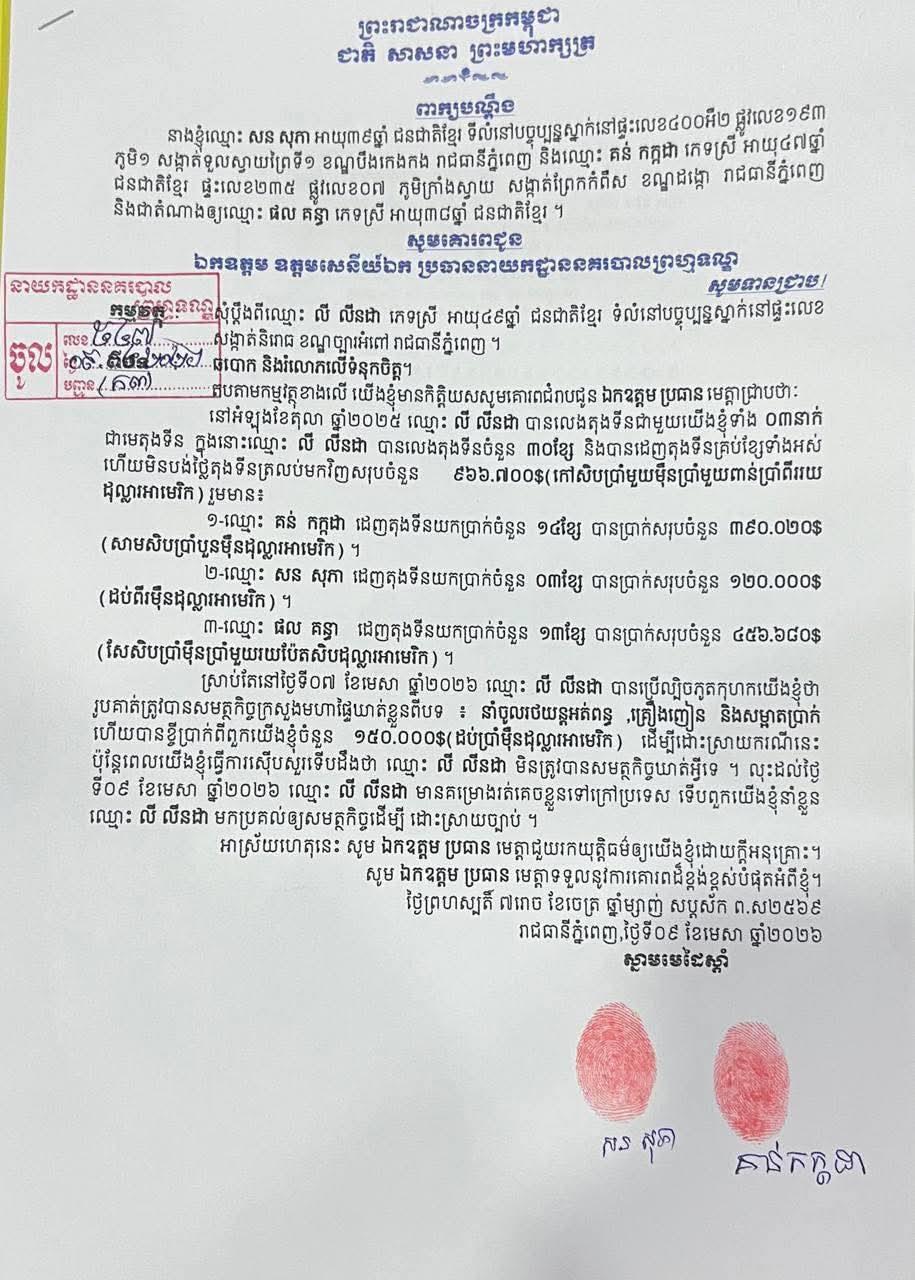 ស្រាប់តែនៅថ្ងៃទី០៧ ខែមេសា ឆ្នាំ២០២៦ ឈ្មោះ លី លីនដា បានប្រើល្បិចភូតកុហកអ្នកទាំង ៣រូបថា គាត់ត្រូវបានសមត្ថកិច្ចក្រសួងមហាផ្ទៃឃាត់ខ្លួនពីបទ៖ នាំចូលរថយន្តអត់ពន្ធ គ្រឿងញៀន និងសម្អាតប្រាក់ ហើយបានខ្ចីប្រាក់ពីអ្នកទាំង ៣រូប ចំនួន ១៥០.០០០ដុល្លារ ដើម្បីដោះស្រាយករណីនេះ ប៉ុន្តែពេលស៉ើបសួរទើបដឹងថា ឈ្មោះ លី លី លីនដា (Kelly Kelly ) មិនត្រូវបានសមត្ថកិច្ចឃាត់អ្វីទេ។ លុះដល់ថ្ងៃ ទី០៩ ខែមេសា ឆ្នាំ២០២៦ ឈ្មោះ លី លីនដា (Kelly Kelly) មានគម្រោងរត់គេចខ្លួនទៅក្រៅប្រទេស ទើបអ្នកទាំង ៣រូប នាំខ្លួនឈ្មោះ លី លីនដា មកប្រគល់ឲ្យសមត្ថកិច្ចក្រសួងមហាផ្ទៃ ដើម្បីដោះស្រាយតាមច្បាប់៕