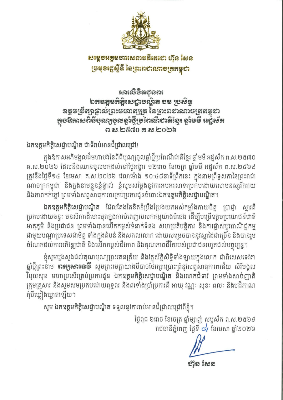 សារលិខិតរបស់សម្តេចតេជោ ហ៊ុន សែន មានខ្លឹមសារទាំងស្រុងដូចតទៅ៖ « ក្នុងឱកាសអភិមង្គលដ៏មហាបវរនៃពិធីបុណ្យចូលឆ្នាំថ្មីប្រពៃណីជាតិខ្មែរ ឆ្នាំមមី អដ្ឋស័ក ព.ស.២៥៧០ គ.ស.២០២៦ ដែលនឹងឈានចូលមកដល់នៅថ្ងៃអង្គារ ១២រោច ខែចេត្រ ឆ្នាំមមី អដ្ឋស័ក ព.ស.២៥៦៩ ត្រូវនឹងថ្ងៃទី១៤ ខែមេសា គ.ស.២០២៦ វេលាម៉ោង ១០:៤៨នាទីព្រឹកនេះ ក្នុងនាមព្រឹទ្ធសភានៃព្រះរាជា ណាចក្រកម្ពុជា និងក្នុងនាមខ្លួនខ្ញុំផ្ទាល់ ខ្ញុំសូមសម្តែងនូវការអបអរសាទរប្រកបដោយសោមនស្សរីករាយ និងភាពកក់ក្តៅ ព្រមទាំងសព្ទសាធុការពរគ្រប់ប្រការជូនចំពោះឯកឧត្តមកិត្តិសេដ្ឋាបណ្ឌិត។