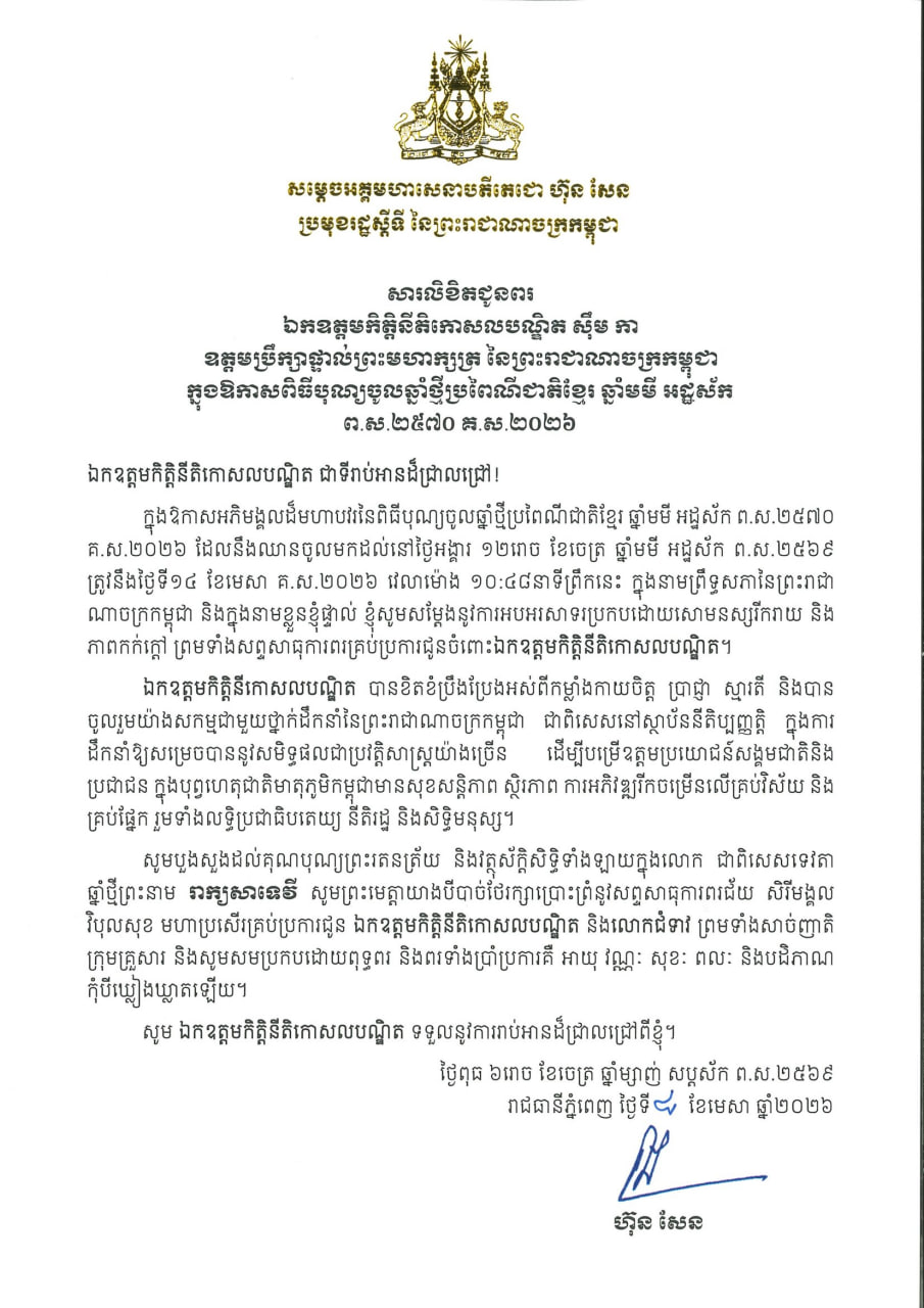 (ភ្នំពេញ)៖ សម្តេចអគ្គមហាសេនាបតីតេជោ ហ៊ុន សែន ប្រមុខរដ្ឋស្តីទីនៃកម្ពុជា បានផ្ញើសារលិខិតសារលិខិតជូនពរ ឯកឧត្តមកិត្តិនីតិកោសលបណ្ឌិត ស៊ឹម កា ឧត្តមប្រឹក្សាផ្ទាល់ព្រះមហាក្សត្រ នៃព្រះរាជាណាចក្រកម្ពុជា ក្នុងឱកាសពិធីបុណ្យចូលឆ្នាំថ្មីប្រពៃណីជាតិខ្មែរ ឆ្នាំមមី អដ្ឋស័ក ព.ស.២៥៧០ គ.ស.២០២៦។
