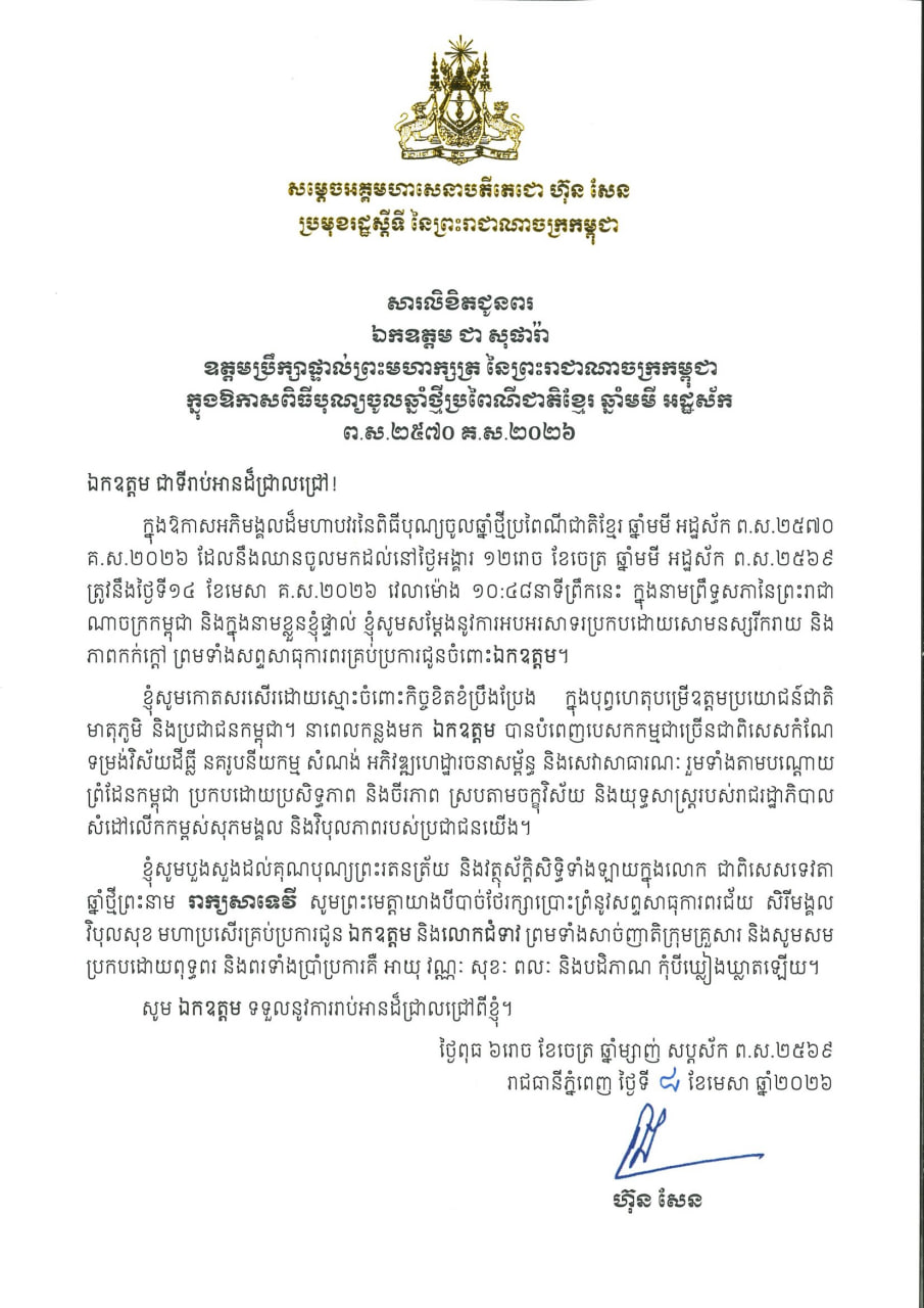 សារលិខិតរបស់សម្តេចតេជោ ហ៊ុន សែន មានខ្លឹមសារទាំងស្រុងដូចតទៅ៖ « ក្នុងឱកាសអភិមង្គលដ៏មហាបវរនៃពិធីបុណ្យចូលឆ្នាំថ្មីប្រពៃណីជាតិខ្មែរ ឆ្នាំមមី អដ្ឋស័ក ព.ស.២៥៧០ គ.ស.២០២៦ ដែលនឹងឈានចូលមកដល់នៅថ្ងៃអង្គារ ១២រោច ខែចេត្រ ឆ្នាំមមី អដ្ឋស័ក ព.ស.២៥៦៩ ត្រូវនឹងថ្ងៃទី១៤ ខែមេសា គ.ស.២០២៦ វេលាម៉ោង ១០:៤៨នាទីព្រឹកនេះ ក្នុងនាមព្រឹទ្ធសភានៃព្រះរាជា ណាចក្រកម្ពុជា និងក្នុងនាមខ្លួនខ្ញុំផ្ទាល់ ខ្ញុំសូមសម្តែងនូវការអបអរសាទរប្រកបដោយសោមនស្សរីករាយ និង ភាពកក់ក្តៅ ព្រមទាំងសព្ទសាធុការពរគ្រប់ប្រការជូនចំពោះឯកឧត្តម។