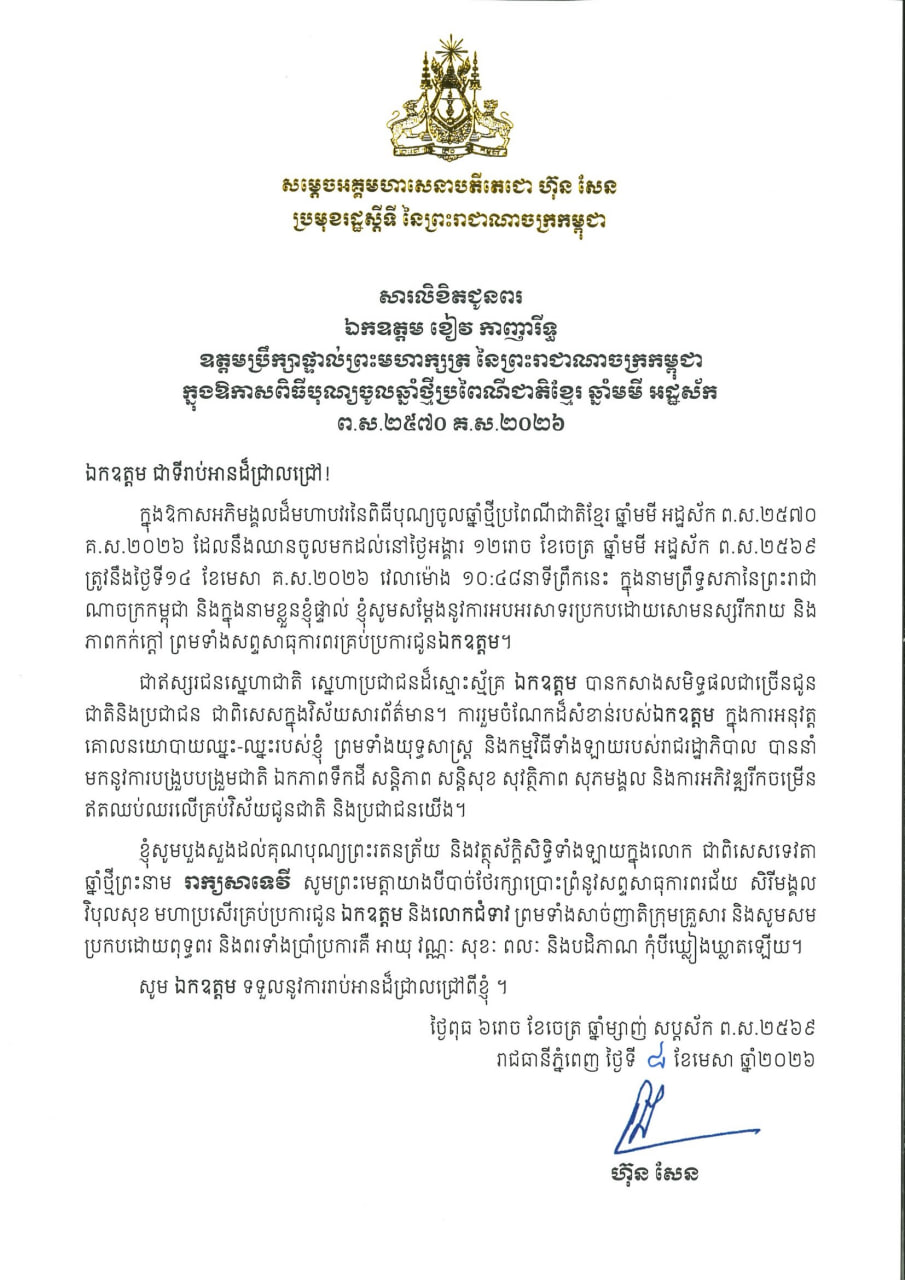 សារលិខិតរបស់សម្តេចតេជោ ហ៊ុន សែន មានខ្លឹមសារទាំងស្រុងដូចតទៅ៖ « ក្នុងឱកាសអភិមង្គលដ៏មហាបវរនៃពិធីបុណ្យចូលឆ្នាំថ្មីប្រពៃណីជាតិខ្មែរ ឆ្នាំមមី អដ្ឋស័ក ព.ស.២៥៧០ គ.ស.២០២៦ ដែលនឹងឈានចូលមកដល់នៅថ្ងៃអង្គារ ១២រោច ខែចេត្រ ឆ្នាំមមី អដ្ឋស័ក ព.ស.២៥៦៩ ត្រូវនឹងថ្ងៃទី១៤ ខែមេសា គ.ស.២០២៦ វេលាម៉ោង ១០:៤៨នាទីព្រឹកនេះ ក្នុងនាមព្រឹទ្ធសភានៃព្រះរាជា ណាចក្រកម្ពុជា និងក្នុងនាមខ្លួនខ្ញុំផ្ទាល់ ខ្ញុំសូមសម្តែងនូវការអបអរសាទរប្រកបដោយសោមនស្សរីករាយ និង ភាពកក់ក្តៅ ព្រមទាំងសព្ទសាធុការពរគ្រប់ប្រការជូនឯកឧត្តម។