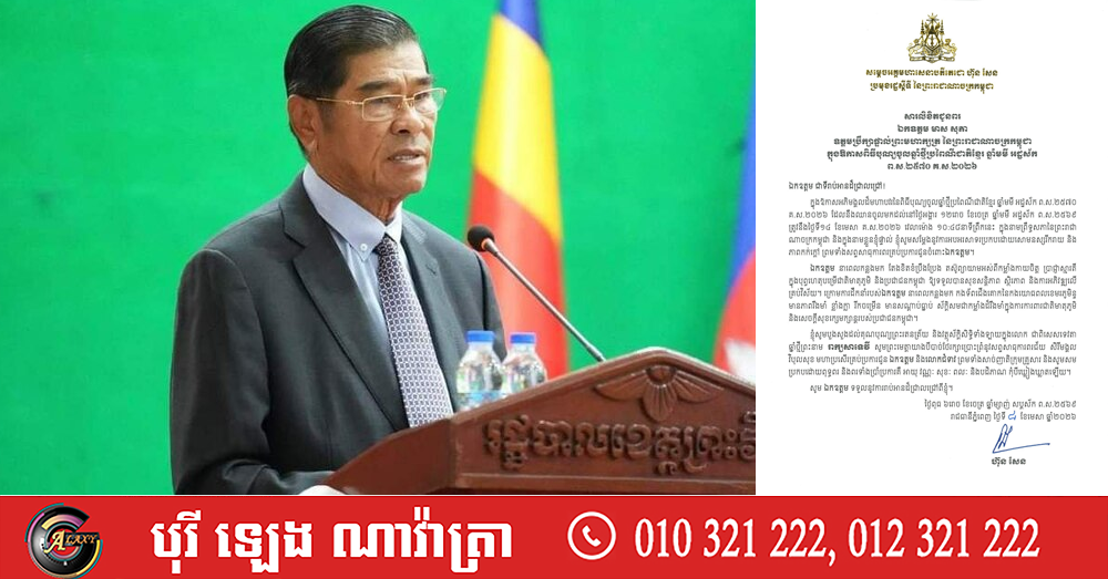 (ភ្នំពេញ)៖ សម្តេចអគ្គមហាសេនាបតីតេជោ ហ៊ុន សែន ប្រមុខរដ្ឋស្តីទីនៃកម្ពុជា បានផ្ញើសារលិខិតសារលិខិតជូនពរ ឯកឧត្តម មាស សុភា ឧត្តមប្រឹក្សាផ្ទាល់ព្រះមហាក្សត្រ នៃព្រះរាជាណាចក្រកម្ពុជា ក្នុងឱកាសពិធីបុណ្យចូលឆ្នាំថ្មីប្រពៃណីជាតិខ្មែរ ឆ្នាំមមី អដ្ឋស័ក ព.ស.២៥៧០ គ.ស.២០២៦។