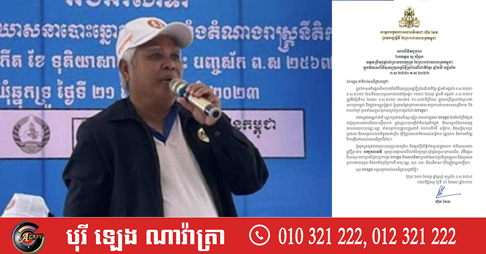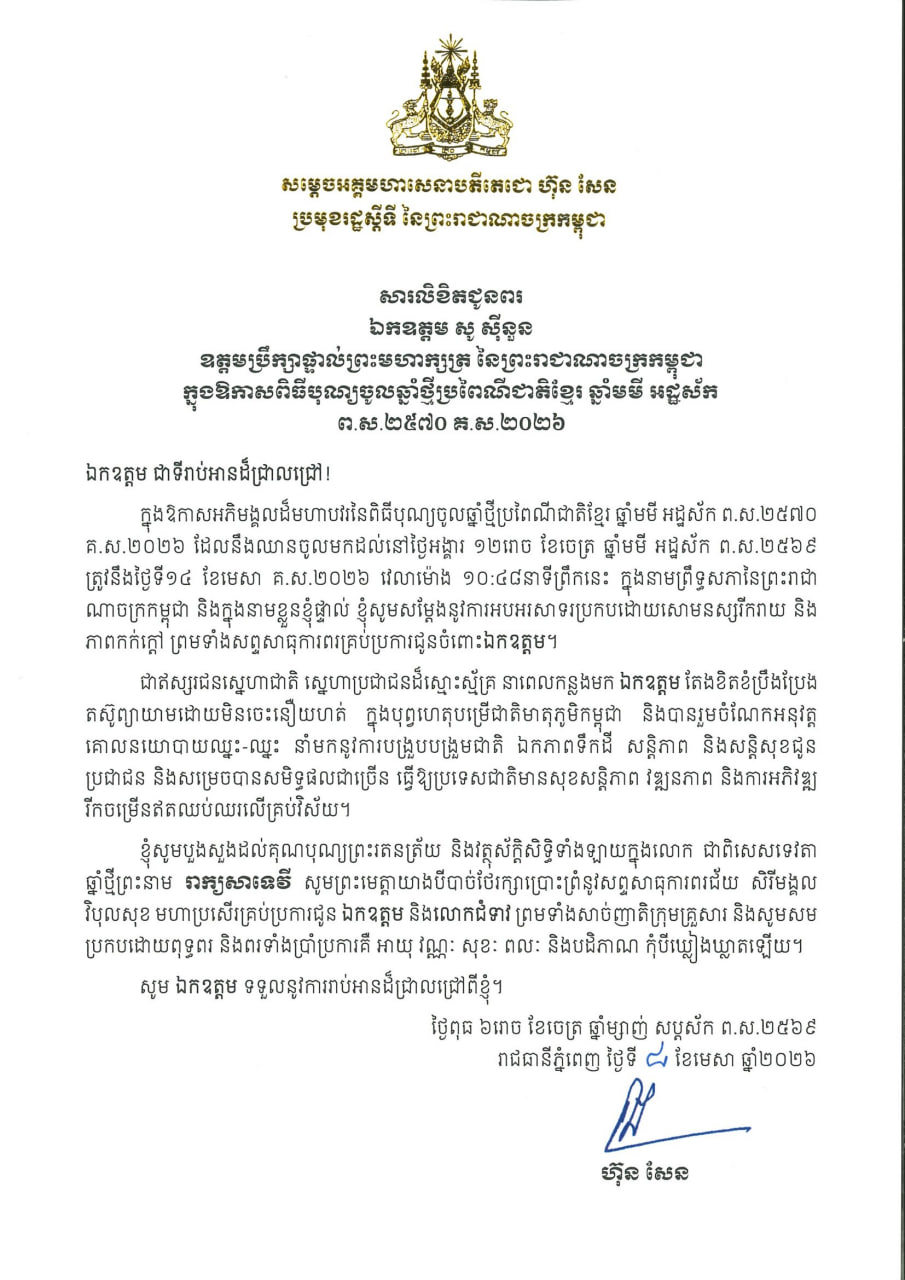 (ភ្នំពេញ)៖ សម្តេចអគ្គមហាសេនាបតីតេជោ ហ៊ុន សែន ប្រមុខរដ្ឋស្តីទីនៃកម្ពុជា បានផ្ញើសារលិខិតសារលិខិតជូនពរ ឯកឧត្តម សូ ស៊ីនួន ឧត្តមប្រឹក្សាផ្ទាល់ព្រះមហាក្សត្រ នៃព្រះរាជាណាចក្រកម្ពុជា ក្នុងឱកាសពិធីបុណ្យចូលឆ្នាំថ្មីប្រពៃណីជាតិខ្មែរ ឆ្នាំមមី អដ្ឋស័ក ព.ស.២៥៧០ គ.ស.២០២៦។