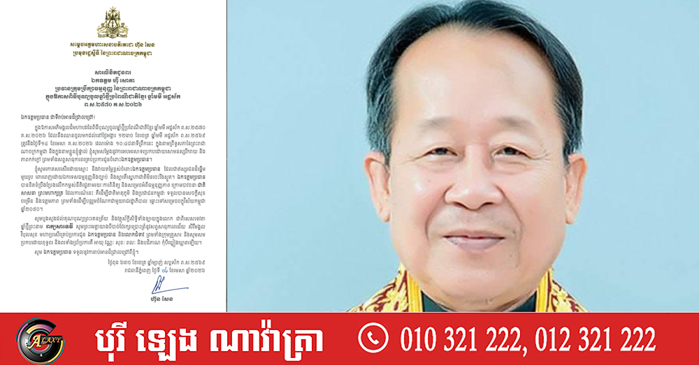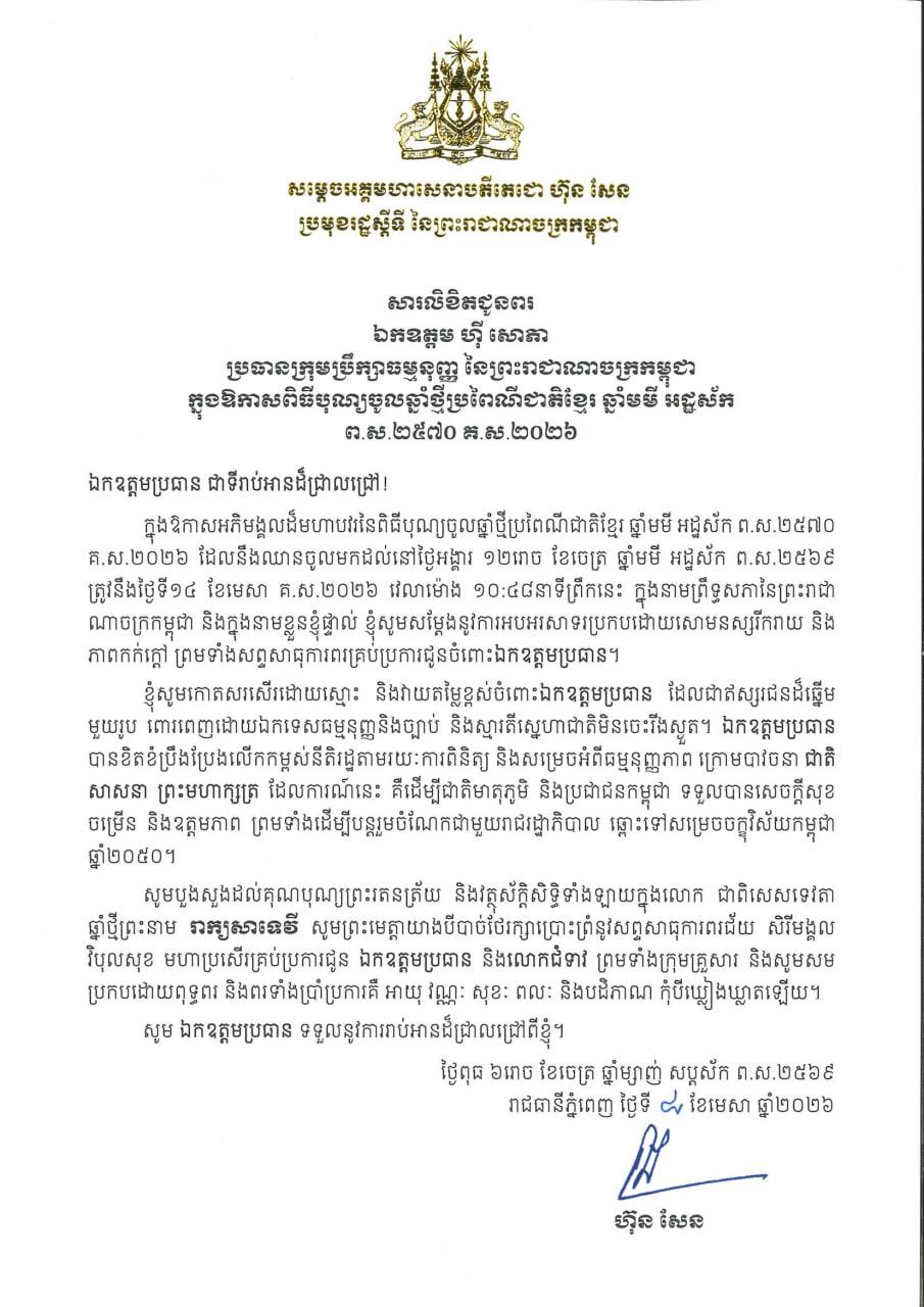 (ភ្នំពេញ)៖ សម្តេចអគ្គមហាសេនាបតីតេជោ ហ៊ុន សែន ប្រមុខរដ្ឋស្តីទីនៃកម្ពុជា បានផ្ញើសារលិខិតជូនពរ ឯកឧត្តម ហ៊ី សោភា ប្រធានក្រុមប្រឹក្សាធម្មនុញ្ញ នៃព្រះរាជាណាចក្រកម្ពុជា ក្នុងឱកាសពិធីបុណ្យចូលឆ្នាំថ្មីប្រពៃណីជាតិខ្មែរ ឆ្នាំមមី អដ្ឋស័ក ព.ស.២៥៧០ គ.ស.២០២៦។