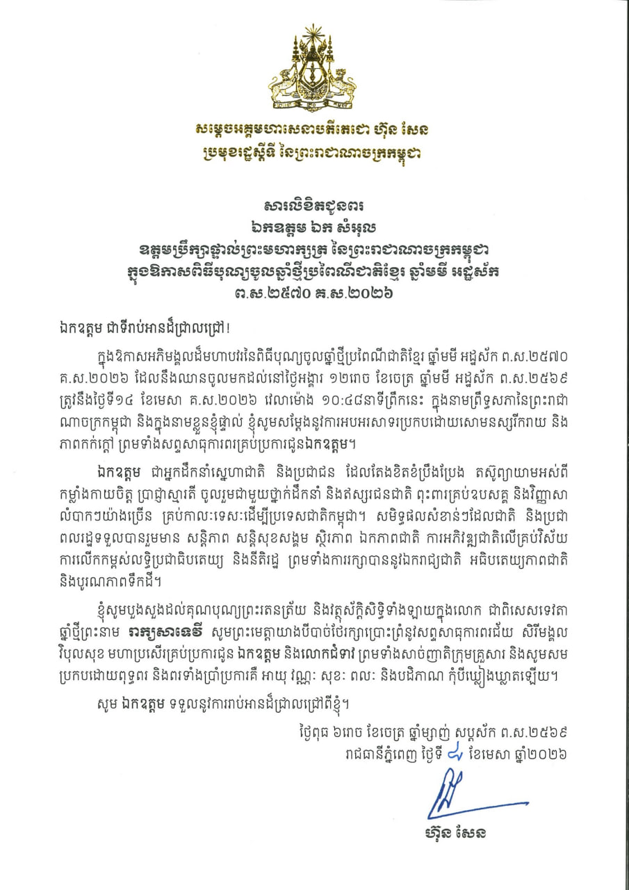 សារលិខិតរបស់សម្តេចតេជោ ហ៊ុន សែន មានខ្លឹមសារទាំងស្រុងដូចតទៅ៖ « ក្នុងឱកាសអភិមង្គលដ៏មហាបវរនៃពិធីបុណ្យចូលឆ្នាំថ្មីប្រពៃណីជាតិខ្មែរ ឆ្នាំមមី អដ្ឋស័ក ព.ស.២៥៧០ គ.ស.២០២៦ ដែលនឹងឈានចូលមកដល់នៅថ្ងៃអង្គារ ១២រោច ខែចេត្រ ឆ្នាំមមី អដ្ឋស័ក ព.ស.២៥៦៩ ត្រូវនឹងថ្ងៃទី១៤ ខែមេសា គ.ស.២០២៦ វេលាម៉ោង ១០:៤៨នាទីព្រឹកនេះ ក្នុងនាមព្រឹទ្ធសភានៃព្រះរាជា ណាចក្រកម្ពុជា និងក្នុងនាមខ្លួនខ្ញុំផ្ទាល់ ខ្ញុំសូមសម្តែងនូវការអបអរសាទរប្រកបដោយសោមនស្សរីករាយ និង ភាពកក់ក្តៅ ព្រមទាំងសព្ទសាធុការពរគ្រប់ប្រការជូនឯកឧត្តម។