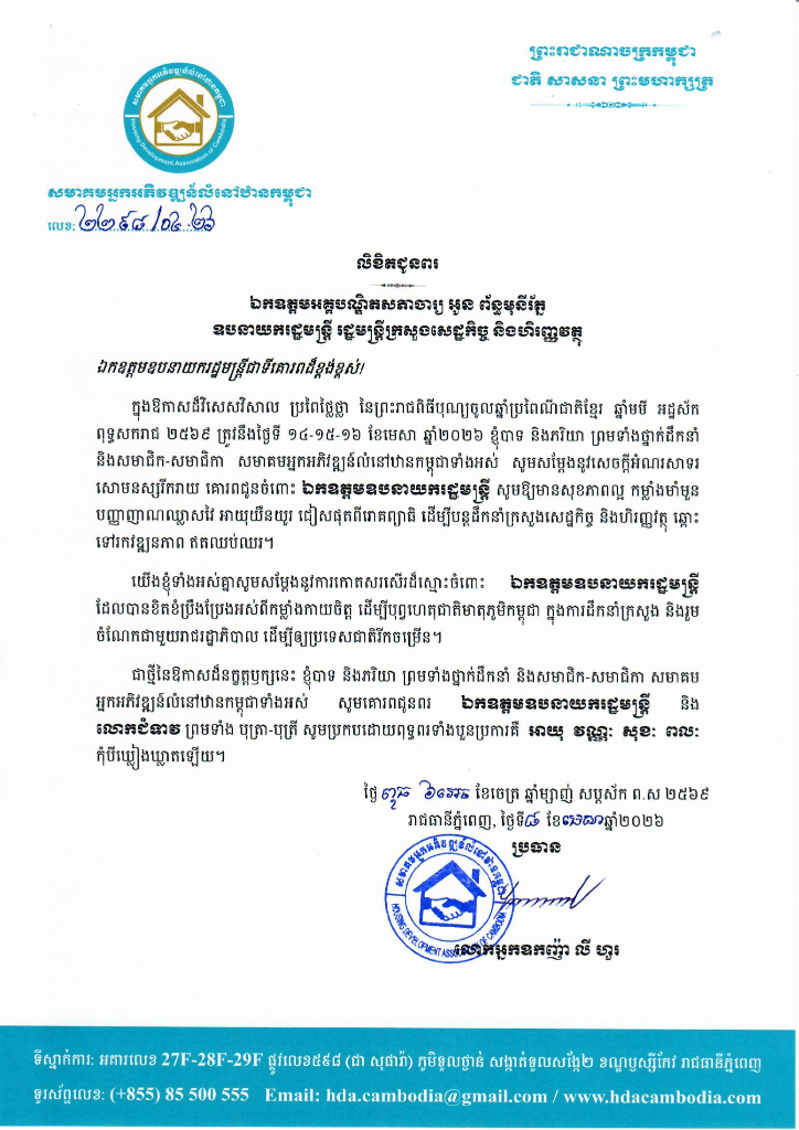 ជាថ្មីនៃឱកាសដ៏នក្ខត្តឫក្សនេះ ខ្ញុំបាទ និងភរិយា ព្រមទាំងថ្នាក់ដឹកនាំ និងសមាជិក-សមាជិកា សមាគម អ្នកអភិវឌ្ឍន៍លំនៅឋានកម្ពុជាទាំងអស់ សូមគោរពជូនពរ ឯកឧត្តមឧបនាយករដ្ឋមន្តី្រ និង លោកជំទាវ ព្រមទាំង បុត្រា-បុត្រី សូមប្រកបដោយពុទ្ធពរទាំងបួនប្រការគឺ អាយុ វណ្ណៈ សុខៈ ពលៈ កុំបីឃ្លៀងឃ្លាតឡើយ»៕