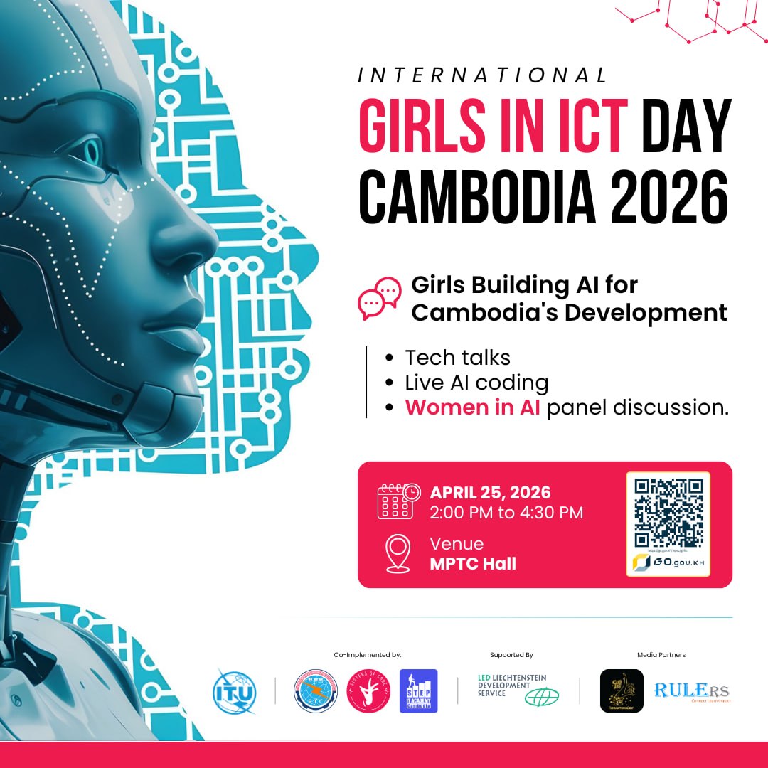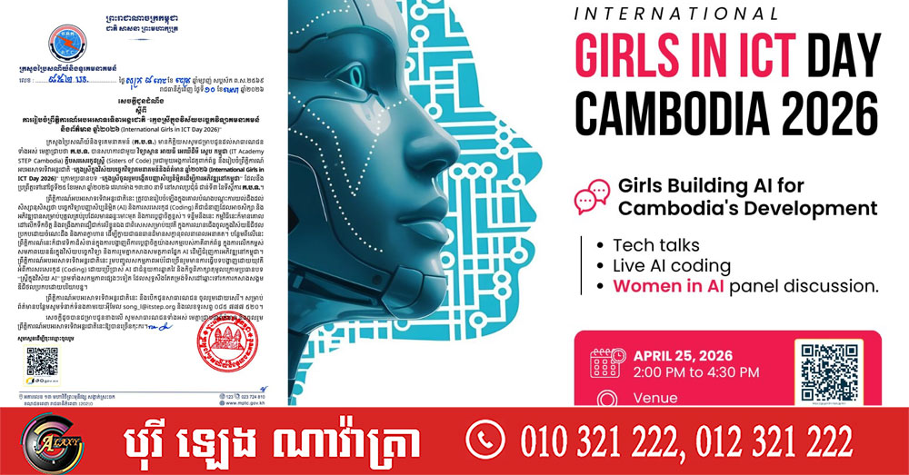 (ភ្នំពេញ)៖ ក្រសួងប្រៃសណីយ៍និងទូរគមនាគមន៍ (ក.ប.ទ.) បានសហការជាមួយ វិទ្យាស្ថាន អាយធី អេឃើដឺមី ស្ទេប កម្ពុជា (IT Academy STEP Cambodia) ក្លឹបសរសេរកូដស្រ្តី (Sisters of Code) រួមជាមួយអង្គការដៃគូពាក់ព័ន្ធ នឹងរៀបចំព្រឹត្តិការណ៍អបអរសាទរទិវាអន្តរជាតិ «ក្មេងស្រីក្នុងវិស័យបច្ចេកវិទ្យាគមនាគមន៍និងព័ត៌មាន ឆ្នាំ២០២៦ (International Girls in ICT Day 2026)» ក្រោមប្រធានបទ “ក្មេងស្រីចូលរួមបង្កើតបញ្ញាសិប្បនិម្មិតដើម្បីការអភិវឌ្ឍនៅកម្ពុជា” ដែលនឹងប្រព្រឹត្តទៅនៅថ្ងៃទី២៥ ខែមេសា ឆ្នាំ២០២៦ វេលាម៉ោង ១៣:៣០ នាទី នៅសាលប្រជុំធំ ជាន់ទី៣ នៃទីស្តីការ ក.ប.ទ.។