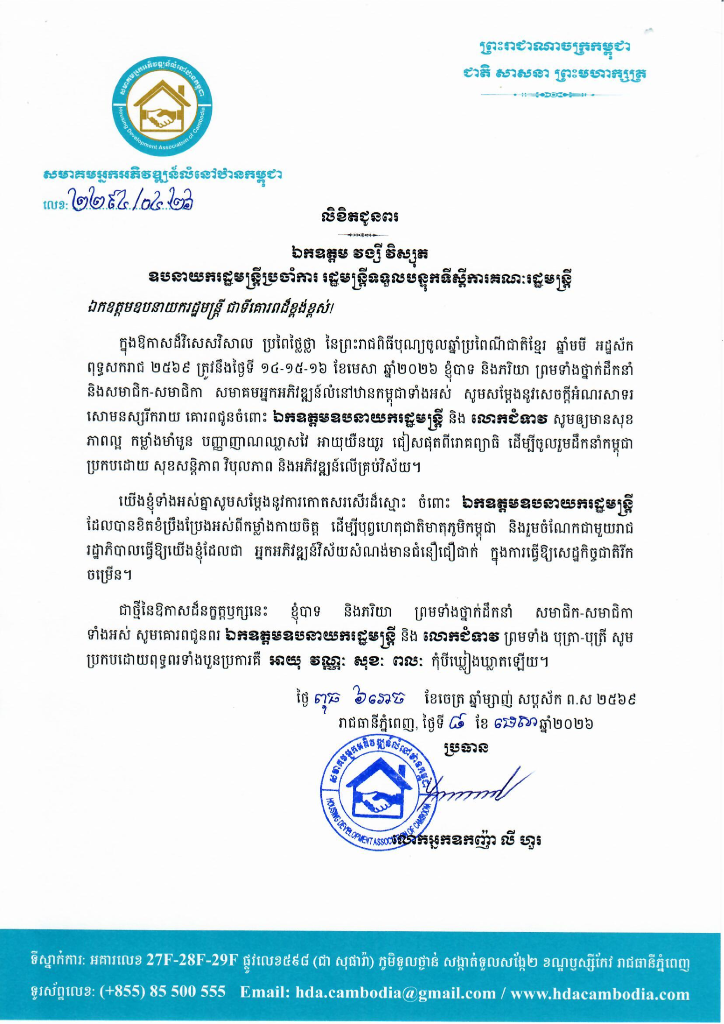 (ភ្នំពេញ)៖ លោកអ្នកឧកញ៉ា លី ហួរ ព្រមទាំងថ្នាក់ដឹកនាំ សមាជិក-សមាជិកា នៃសមាគមអ្នកអភិវឌ្ឍន៍លំនៅឋានកម្ពុជាទាំងអស់ សូមផ្ញើសារលិខិតគោរពជូនពរ ឯកឧត្តម វង្សី វិស្សុត ឧបនាយករដ្ឋមន្ត្រីប្រចាំការ រដ្ឋមន្ត្រីទទួលបន្ទុកទីស្តីការគណៈរដ្ឋមន្តី្រ និងលោកជំទាវ នៅក្នុងឱកាសពិធីបុណ្យចូលឆ្នាំថ្មី ប្រពៃណីជាតិខ្មែរ ឆ្នាំមមី អដ្ឋស័ក ពុទ្ធសករាជ ២៥៦៩។