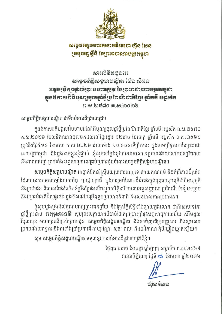 (ភ្នំពេញ)៖ សម្តេចអគ្គមហាសេនាបតីតេជោ ហ៊ុន សែន ប្រមុខរដ្ឋស្តីទីនៃកម្ពុជា បានផ្ញើសារលិខិតជូនពរ សម្តេចកិត្តិសង្គហបណ្ឌិត ម៉ែន សំអន ឧត្តមប្រឹក្សាផ្ទាល់ព្រះមហាក្សត្រ នៃព្រះរាជាណាចក្រកម្ពុជា ក្នុងឱកាសពិធីបុណ្យចូលឆ្នាំថ្មីប្រពៃណីជាតិខ្មែរ ឆ្នាំមមី អដ្ឋស័ក ព.ស.២៥៧០ គ.ស.២០២៦។