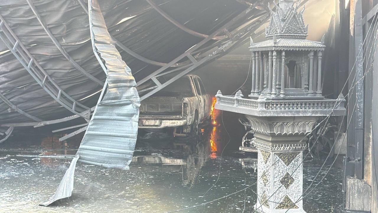 របាយការណ៍របស់សមត្ថកិច្ចបានបញ្ជាក់ថា ម្ចាស់ទីតាំងឈ្មោះ ទ្រី សុខលី អាយុ៤២ឆ្នាំ មុខរបរអាជីវករ។ ប្រភេទសំណង់ថ្មប្រក់ស័ង្កសី ទំហំ១០០ម៉ែត្រ គុណ៣០ម៉ែត្រ។ ខូចខាតសម្ភារឆេះឃ្លាំងថ្មប្រក់ស័ង្កសី, រថយន្តចំនួន១, ម៉ូតូចំនួន១គ្រឿង រួមទាំងសម្ភារអស់ទាំងស្រុង និងឆេះរោលជញ្ជាំងផ្ទះថ្មចំនួន២ខ្នង។