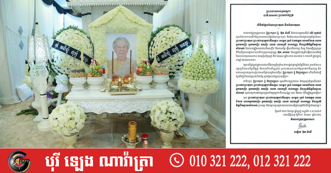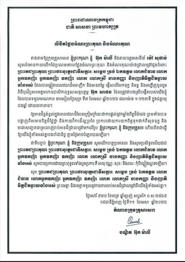 (ភ្នំពេញ)៖ លោកជំទាវបណ្ឌិត អ៊ុក ម៉ាលី និងនាយឧត្តមសេនីយ៍ ម៉ៅ សុផាន់ បានផ្ញើសារថ្លែងអំណរព្រះគុណ និងអំណរគុណ យ៉ាងជ្រាលជ្រៅជូនចំពោះ ព្រះតេជព្រះគុណ ព្រះថេរានុត្ថេរជាទីសក្ការៈ សម្តេច ទ្រង់ ឯកឧត្តម លោកជំទាវ លោក អ្នកឧកញ៉ា អ្នកឧកញ៉ា ឧកញ៉ា លោក លោកស្រី នាងកញ្ញា និងញាតិមិត្តជិតឆ្ងាយ ទាំងអស់ ដែលបានឆ្លៀតពេលវេលាដ៏មមាញឹក និងមានតម្លៃ ផ្ញើសាររំលែកទុក្ខ និមន្ត និងអញ្ជើញចូលរួម ពិធីបុណ្យសពអគ្គមហាឧបាសិកាពុទ្ធសាសនូបត្ថម្ភ អ៊ុក សាផន ដែលបានទទួលមរណភាព នារសៀលថ្ងៃសុក្រ ទី៣ ខែមេសា ឆ្នាំ២០២៦កន្លងទៅ។