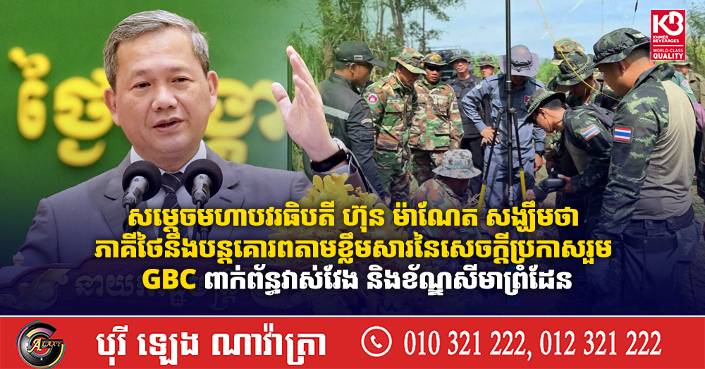 សម្ដេចមហាបវរធិបតី ហ៊ុន ម៉ាណែត សង្ឃឹមថា ភាគីថៃនឹងបន្ដគោរពតាមខ្លឹមសារនៃសេចក្ដីប្រកាសរួម GBC ពាក់ព័ន្ធវាស់វែង និងខ័ណ្ឌសីមាព្រំដែន