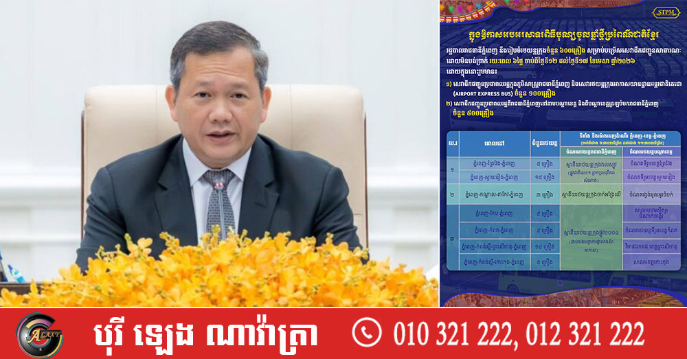 សម្តេចបវរធិបតី ហ៊ុន ម៉ាណែត អំពាវនាវដល់កម្មករ-និយោជិត និងប្រជាពលរដ្ឋ ធ្វើដំណើរទៅស្រុកកំណើត តាមរថយន្តក្រុងរាជធានីភ្នំពេញ ដោយឥតគិតថ្លៃ ចាប់ពីថ្ងៃទី១២ ដល់ថ្ងៃទី១៧ ខែមេសា ឆ្នាំ២០២៦