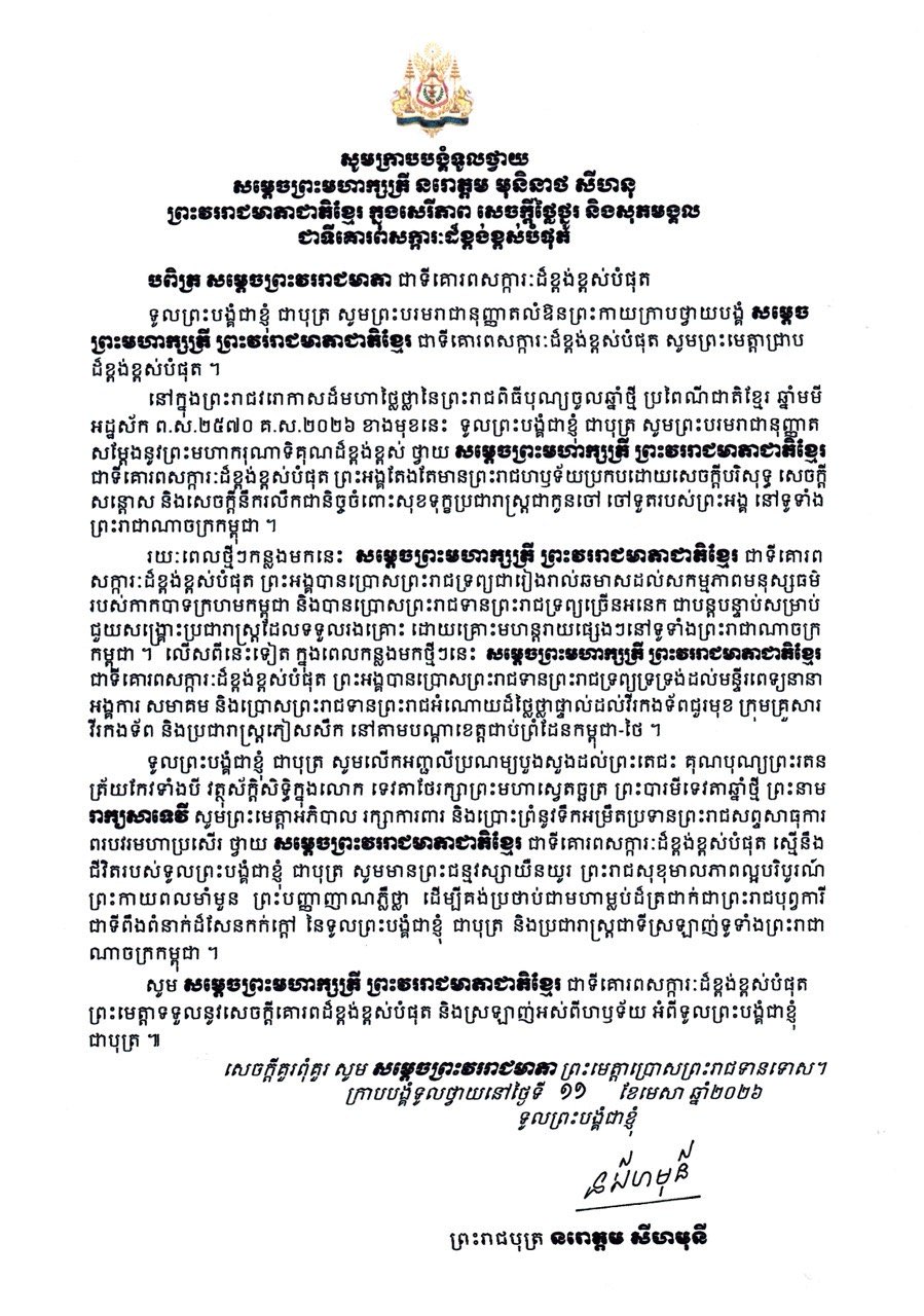 (ភ្នំពេញ)៖ ព្រះករុណា ព្រះបាទសម្ដេចព្រះបរមនាថ នរោត្តម សីហមុនី ព្រះមហាក្សត្របនៃព្រះរាជាណាចក្រកម្ពុជា បានសូមក្រាបបង្គំ សូមព្រះបរមរាជានុញ្ញាត សម្តែងនូវព្រះមហាករុណាទិគុណដ៏ខ្ពង់ខ្ពស់ ថ្វាយ សម្តេចព្រះមហាក្សត្រី ព្រះវររាជមាតាជាតិខ្មែរ ជាទីគោរពសក្ការៈដ៏ខ្ពង់ខ្ពស់បំផុត ក្នុងឱកាសនៃព្រះរាជពិធីបុណ្យចូលឆ្នាំថ្មី ប្រពៃណីជាតិខ្មែរ ឆ្នាំមមី អដ្ឋស័ក ព.ស.២៥៧០ គ.ស.២០២៦។