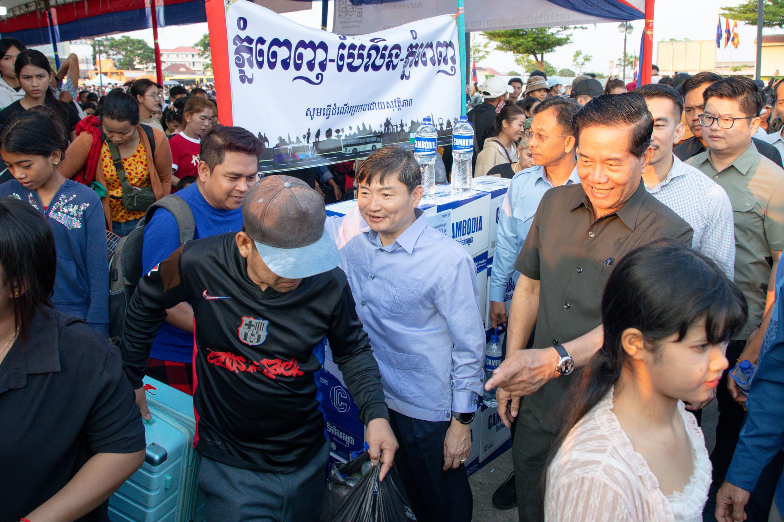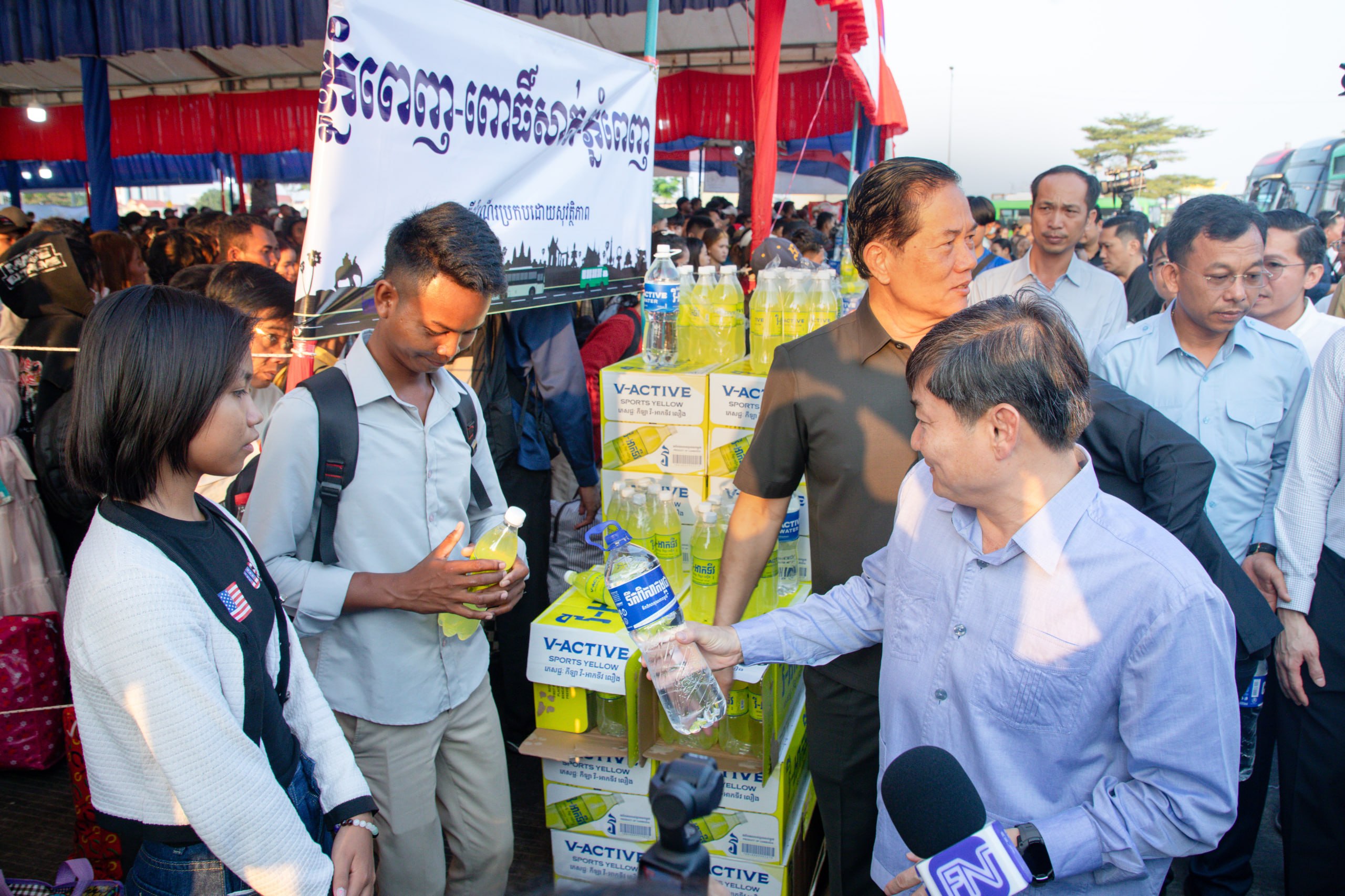 (ភ្នំពេញ)៖ លោក ហេង សួរ រដ្ឋមន្ត្រីក្រសួងការងារ និងបណ្ដុះបណ្ដាលវិជ្ជាជីវៈ និងលោក ឃួង ស្រេង អភិបាលនៃគណៈអភិបាលរាជធានីភ្នំពេញ បានអញ្ជើញជូនដំណើរបងប្អូនកម្មករនិយោជិត និងប្រជាពលរដ្ឋធ្វើដំណើរទៅលេងស្រុកកំណើត តាមមធ្យោបាយរថយន្តក្រុងរបស់រដ្ឋបាលរាជធានីភ្នំពេញដោយមិនគិតថ្លៃ នាព្រឹកថ្ងៃអាទិត្យ ទី១២ ខែមេសា ឆ្នាំ ២០២៦ នេះ នៅទីលានប្រជាធិបតេយ្យ ស្ថិតក្នុងខណ្ឌឫស្សីកែវ ដែលអនុវត្តតាមអនុសាសន៍ដ៏ខ្ពង់ខ្ពស់របស់សម្ដេចមហាបវរធិបតី ហ៊ុន ម៉ាណែត នាយករដ្ឋមន្ត្រី នៃព្រះរាជាណាចក្រកម្ពុជា។