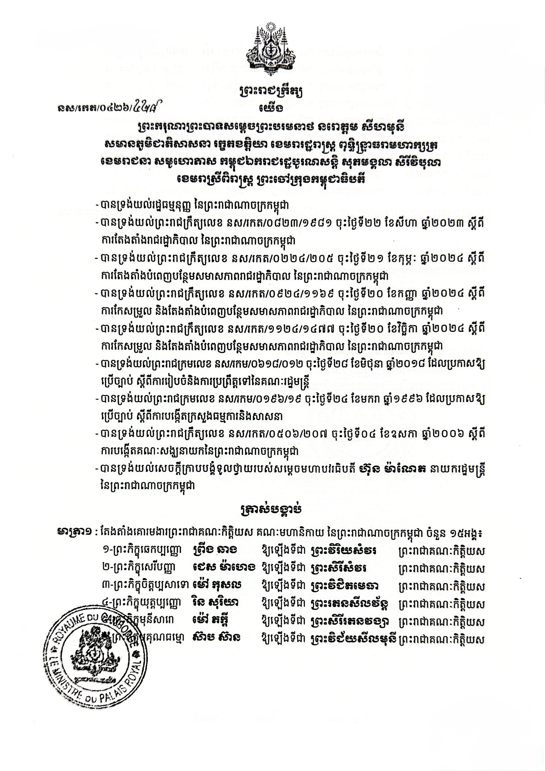 ខាងក្រោមនេះ ជាព្រះរាជក្រឹត្យ៖