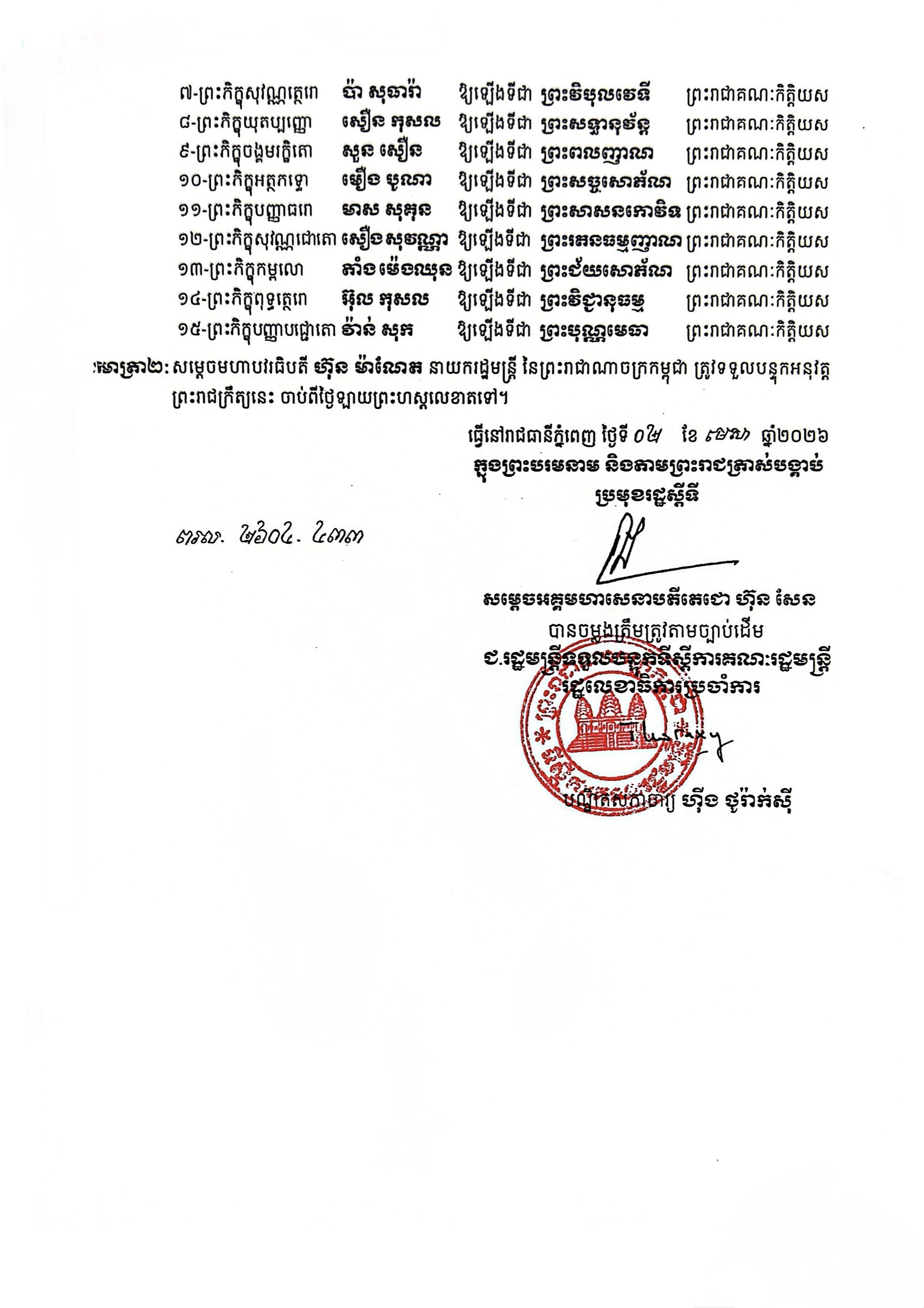 (ភ្នំពេញ)៖ ប្រមុខរដ្ឋស្តីទី សម្តេចតេជោ ហ៊ុន សែន បានចេញព្រះរាជក្រឹត្យត្រាស់បង្គាប់តែងតាំងគោរមងារព្រះរាជាគណៈកិត្តិយស គណៈមហានិកាយ នៃព្រះរាជាណាចក្រកម្ពុជា ចំនួន ១៥អង្គ។ នេះបើតាមព្រះរាជក្រឹត្យ ដែលបណ្តាញព័ត៌មាន Fresh News ទទួលបាន៕