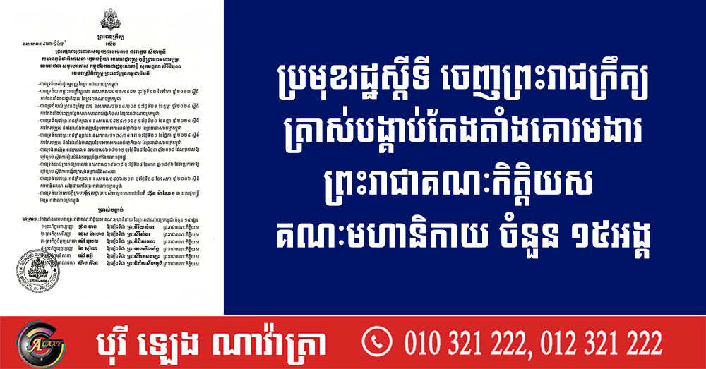 ប្រមុខរដ្ឋស្តីទី ចេញព្រះរាជក្រឹត្យត្រាស់បង្គាប់តែងតាំងគោរមងារព្រះរាជាគណៈកិត្តិយស គណៈមហានិកាយ ចំនួន ១៥អង្គ