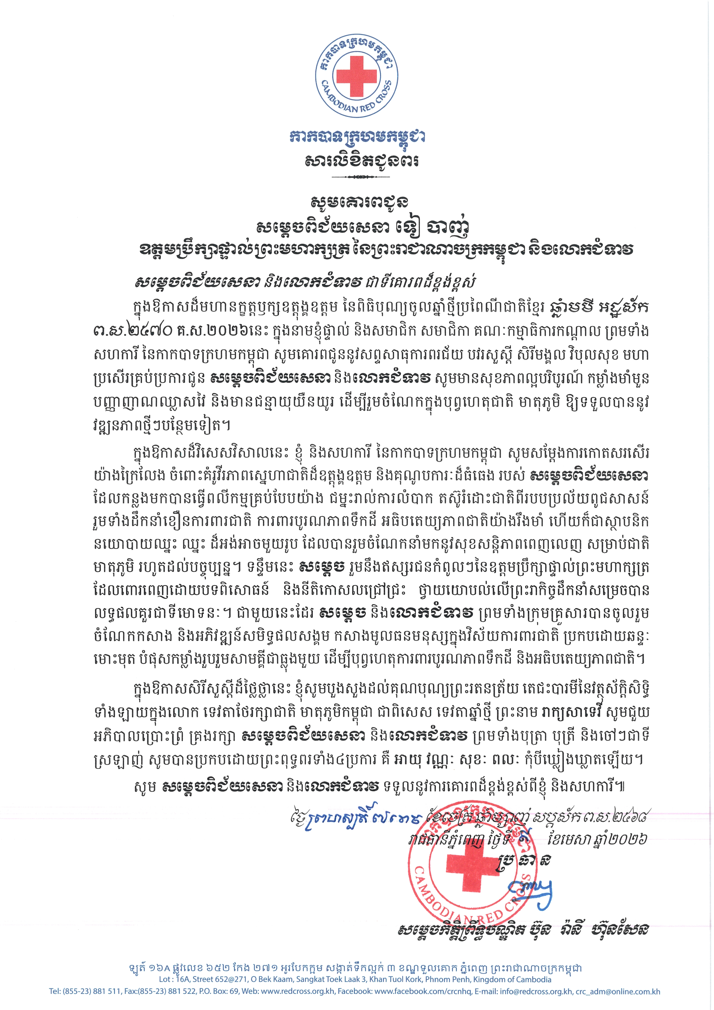 ក្នុងឱកាសដ៏វិសេសវិសាលនេះ យើងខ្ញុំនិងសហការី នៃកាកបាទក្រហមកម្ពុជា សូមសម្តែងការកោតសរសើរយ៉ាងក្រៃលែង ចំពោះគំរូវីរភាពស្នេហាជាតិដ៏ឧត្តុង្គឧត្តម និងគុណូបការៈដ៏ធំធេងរបស់សម្តេចពិជ័យសេនា ដែលកន្លងមកបានធ្វើពលីកម្មគ្រប់បែបយ៉ាង ជម្នះរាល់ការលំបាក តស៊ូរំដោះជាតិពីរបបប្រល័យពូជសាសន៍ រួមទាំងដឹកនាំខឿនការពារជាតិ ការពារបូរណភាពទឹកដី អធិបតេយ្យភាពជាតិយ៉ាងរឹងមាំ ហើយក៏ជាស្ថាបនិក នយោបាយឈ្នះ ឈ្នះ ដ៏អង់អាចមួយរូប ដែលបានរួមចំណែកនាំមកនូវសុខសន្តិភាពពេញលេញ សម្រាប់ជាតិ មាតុភូមិ រហូតដល់បច្ចុប្បន្ន។